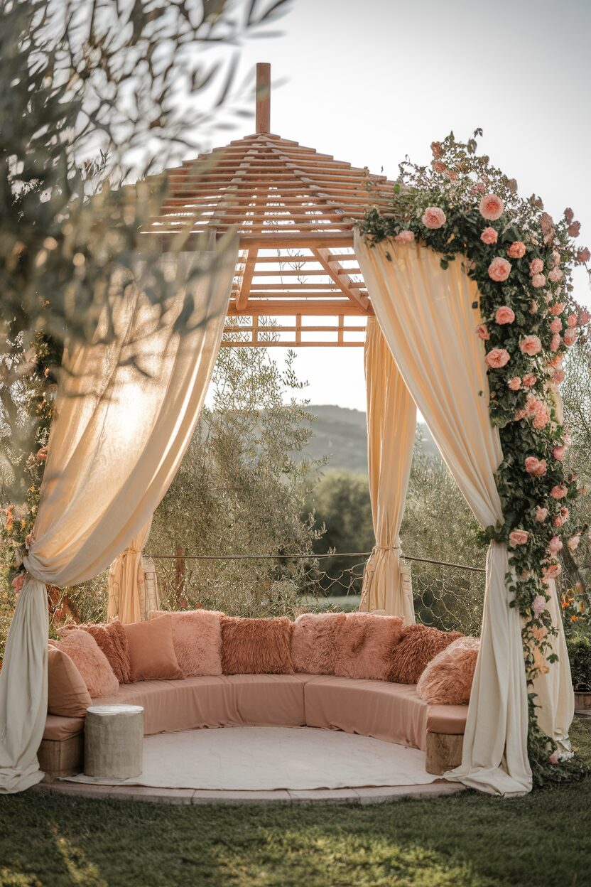 The boho-chic pavilion is all about creativity and comfort. Imagine soft drapes, colorful cushions, and lots of plants.