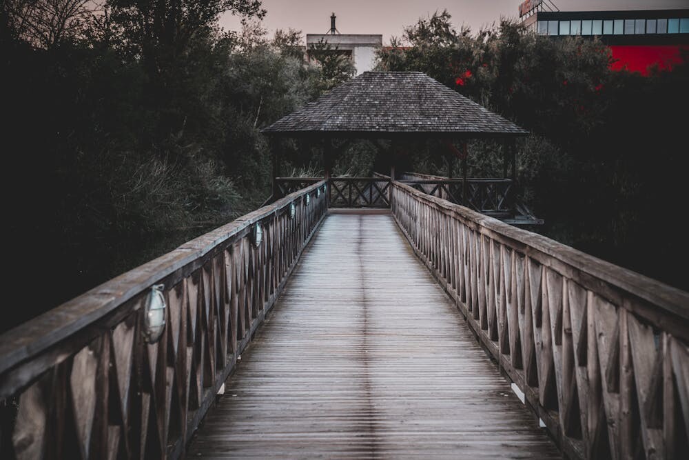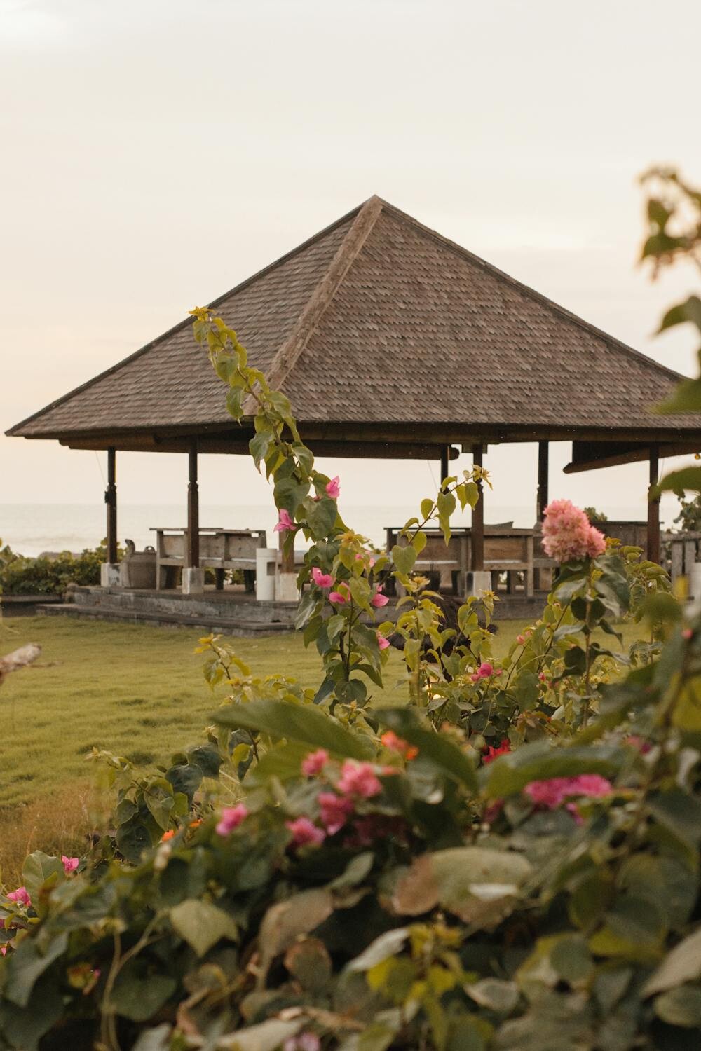 Picture a cozy wooden pavilion nestled amidst lush greenery. This rustic retreat exudes warmth and charm with its natural wood tones and simple design.