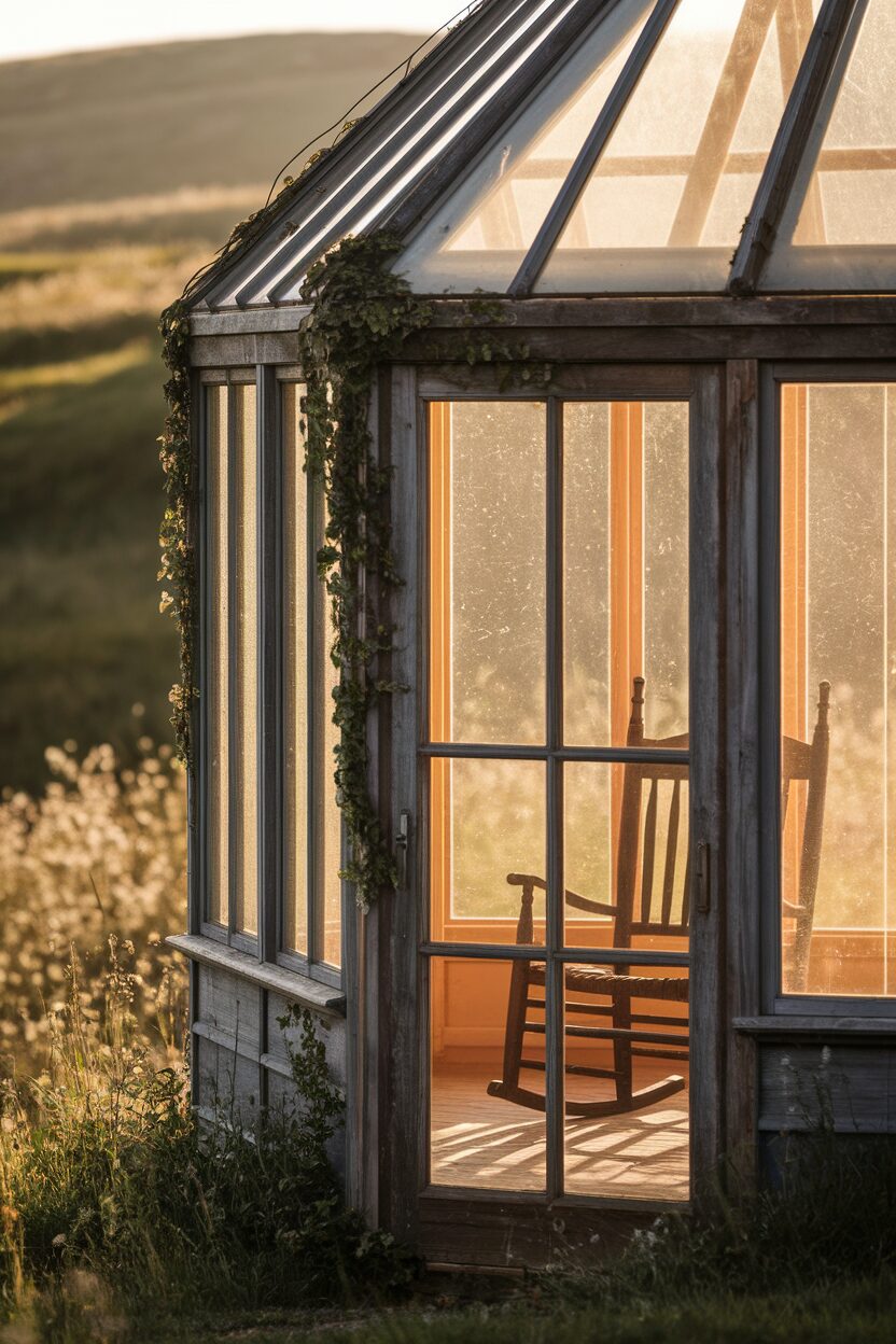 If you love the charm of old-world style, the rustic glass conservatory is just for you. Think vintage windows, wooden frames, and a cozy vibe.