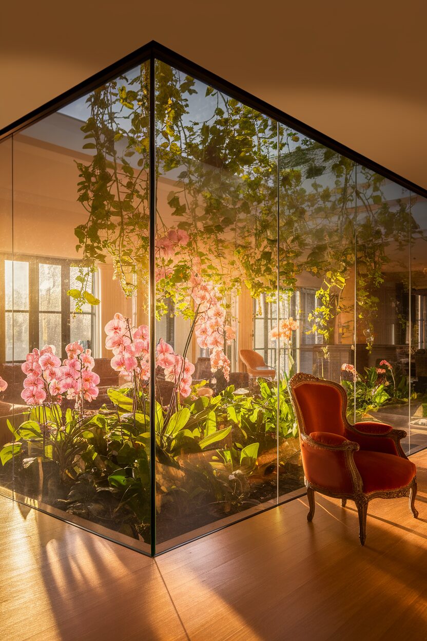 Mix materials for a warm and inviting look with glass walls that include wooden accents. The combination of glass and wood adds texture and warmth, creating a cozy yet modern feel.
