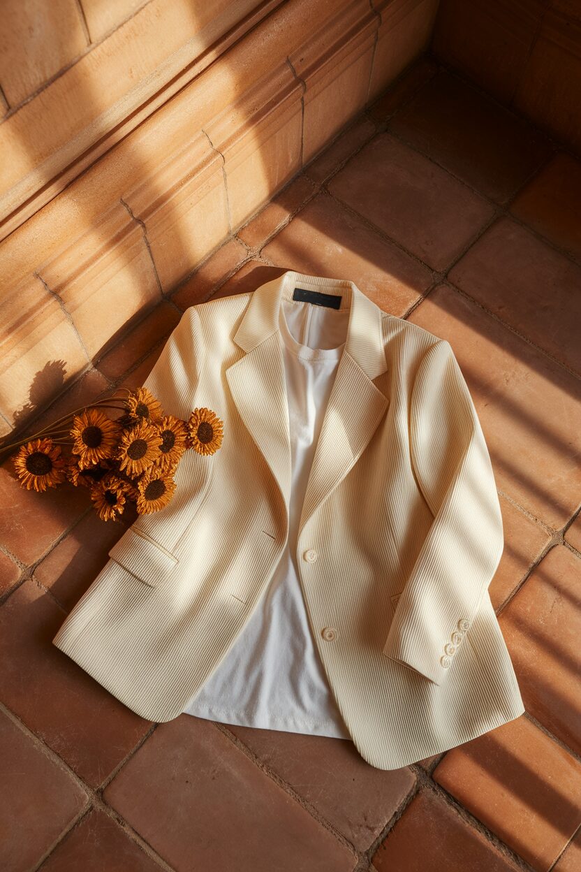 The white tee softens the blazer’s formality, offering a relaxed yet stylish vibe. It’s perfect for casual outings or even a laid-back day at work.