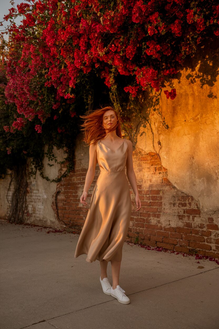 Midi dresses are the unsung heroes of effortless style. Pair one with your favorite sneakers, and you’ve got a look that’s both comfy and chic. Imagine walking through a park, the dress swaying gently with each step, while your sneakers keep you grounded and ready for anything.