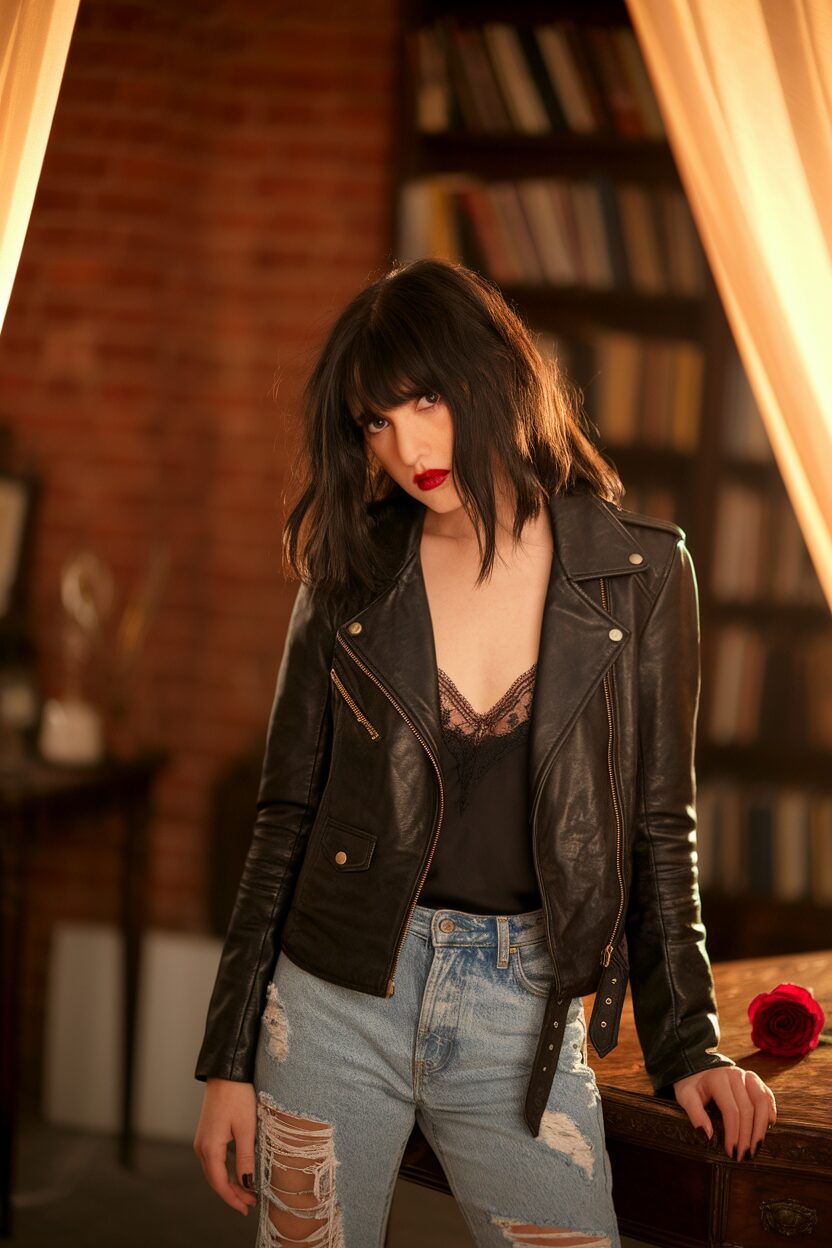 Think leather jackets, ripped jeans, and lots of attitude. This look is about channeling your inner rock star with confidence. Pair your outfit with studded boots and bold accessories like chunky chains.