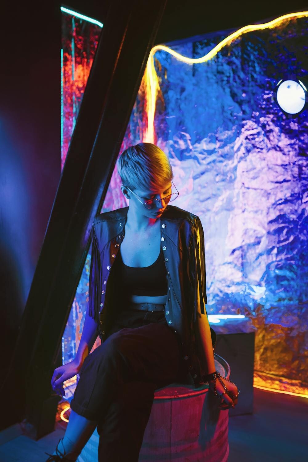 Futuristic and bold, this look features metallic fabrics, neon accents, and unique silhouettes. Think sci-fi meets fashion with a tech-inspired edge. Goggles and geometric jewelry complete the look.