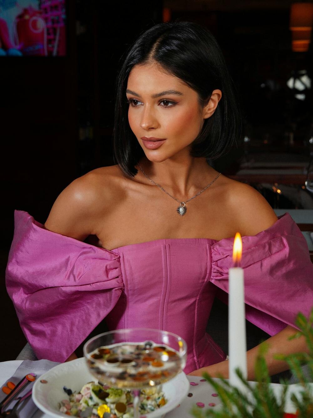This dress is perfect for a cozy evening dinner or a glamorous party. Pair it with simple gold accessories to enhance its luxurious feel. The wrap design is forgiving and suits various body types, making it a versatile choice.