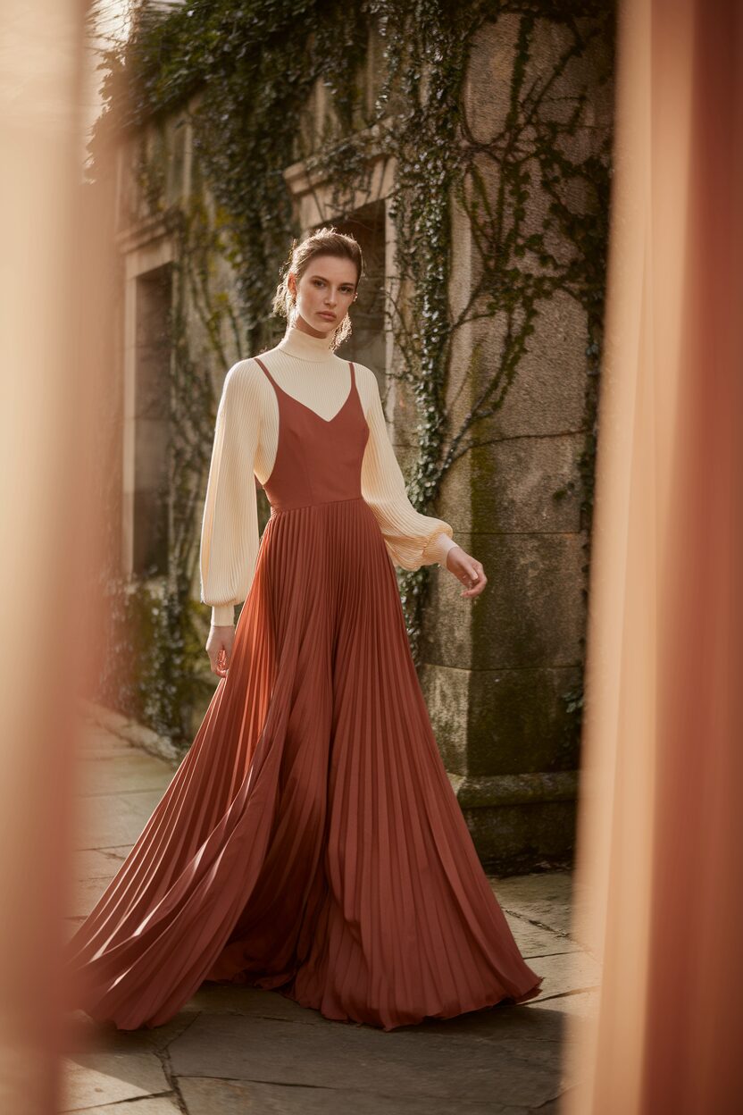 Imagine twirling in a flowy maxi dress layered over a snug turtleneck. This look is about elegance and warmth, perfect for chilly days when you still want to wear something breezy.