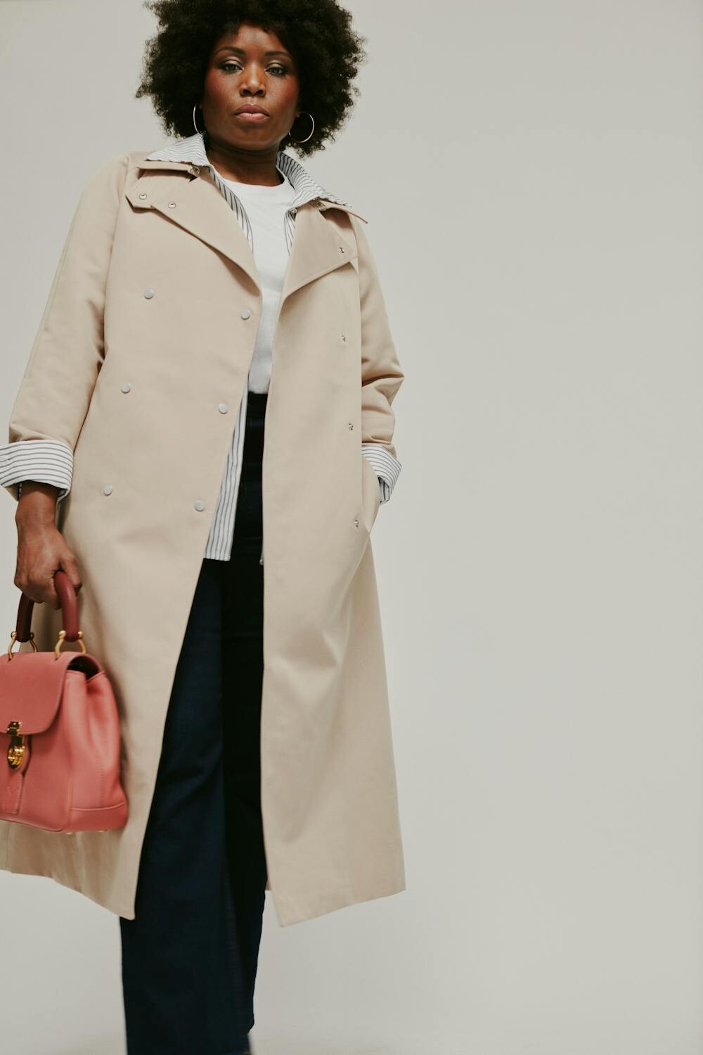 The trench coat adds sophistication, while the striped shirt keeps things fresh and playful. Add a bright scarf or a statement bag for a touch of color.