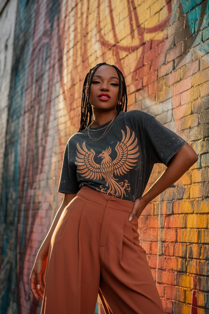 Graphic tees are a staple in urban fashion, but the twist is all about pairing them with unexpected pieces. Try wearing a bold graphic tee with a sleek blazer or a pleated midi skirt. It’s like wearing your personality on your sleeve, literally!