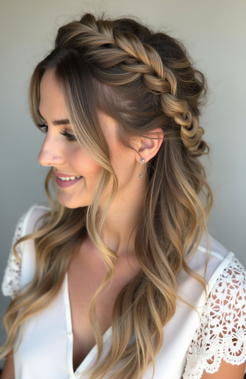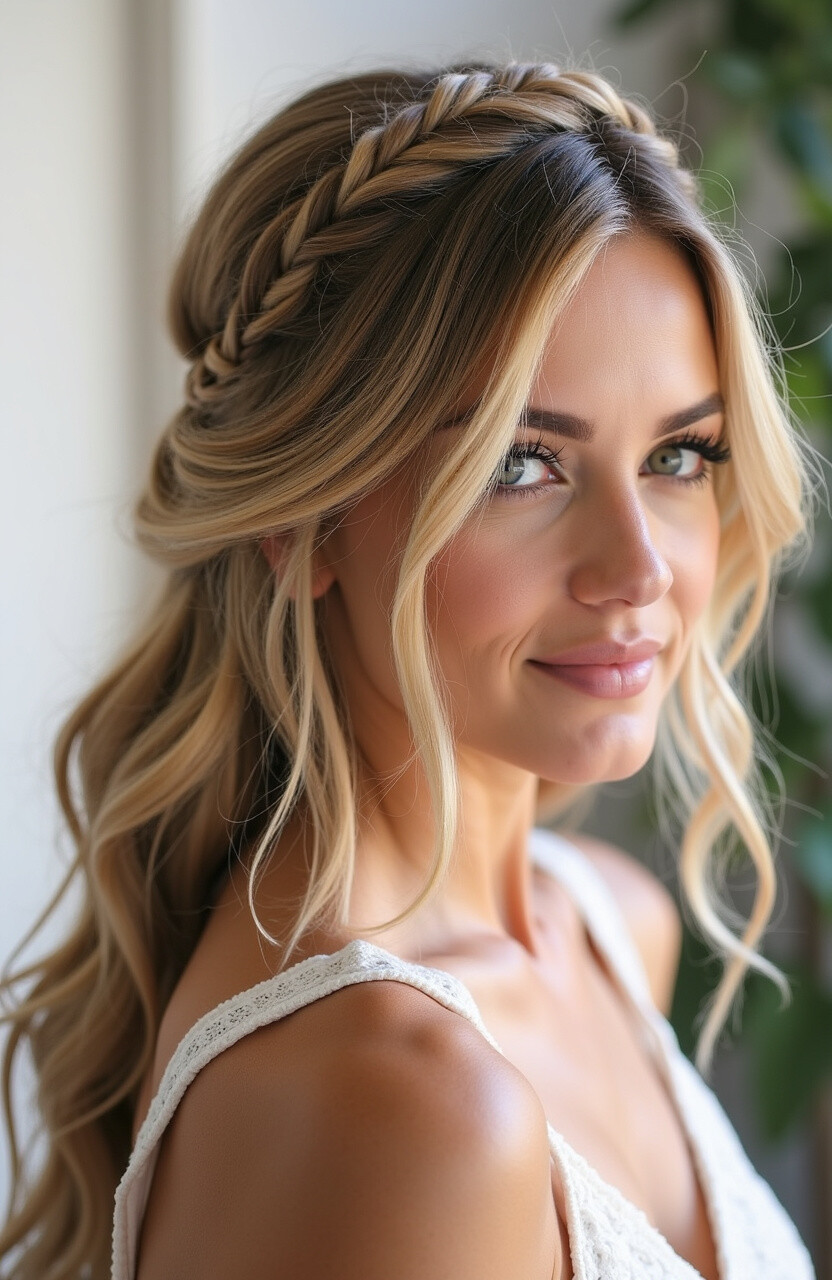 7. Braided Crown with Loose Waves