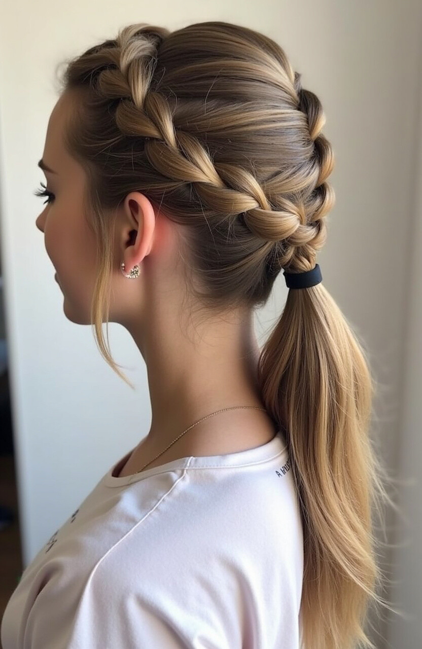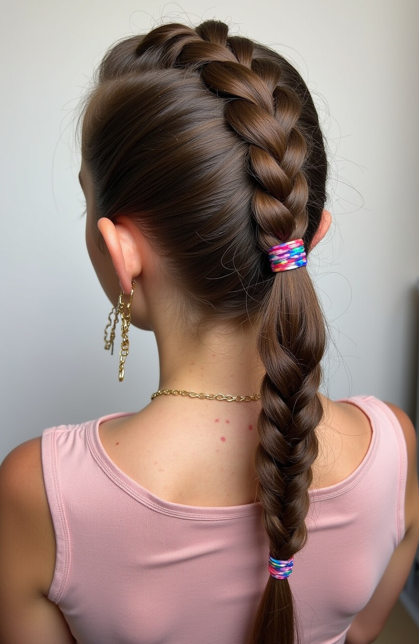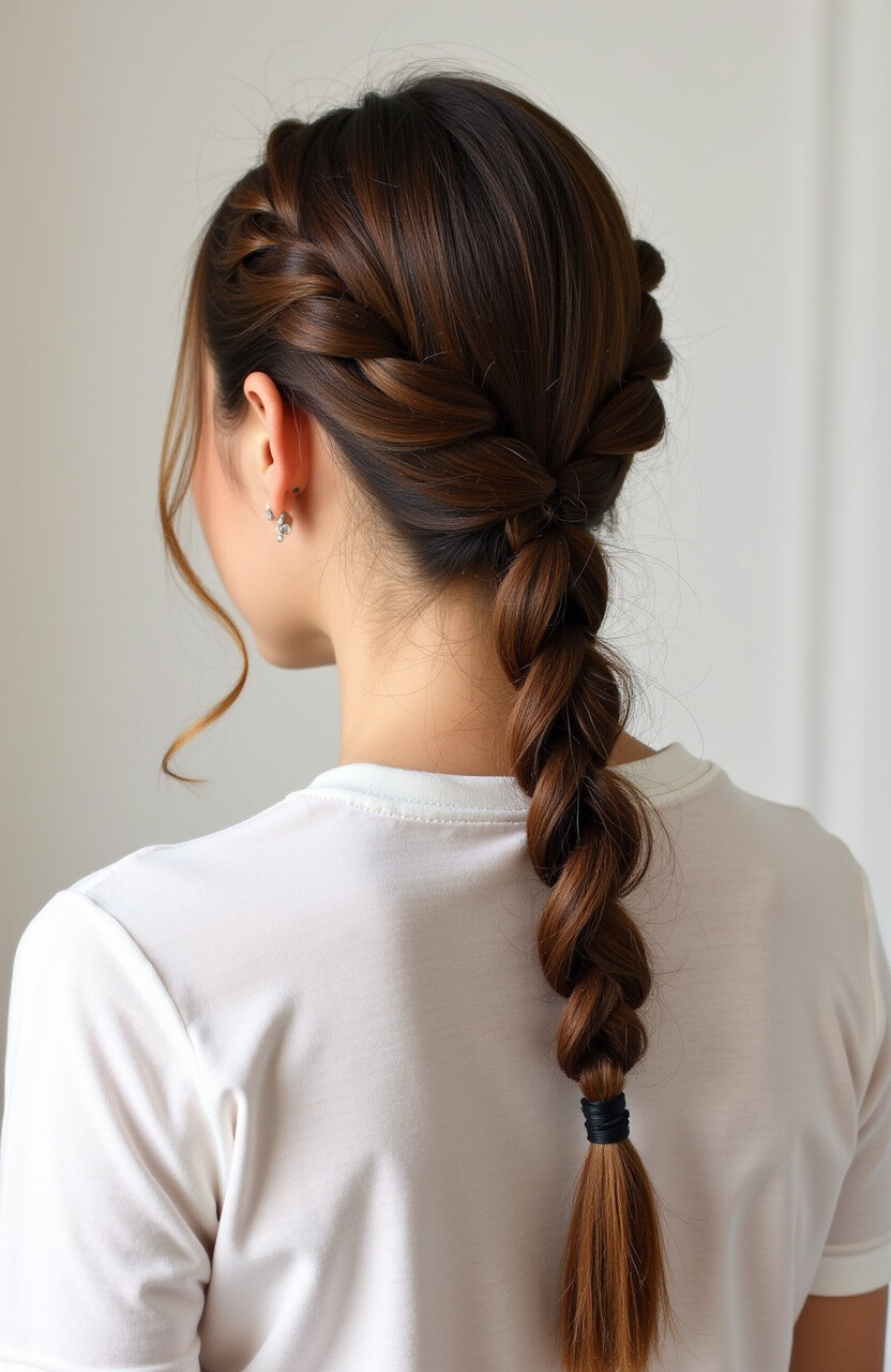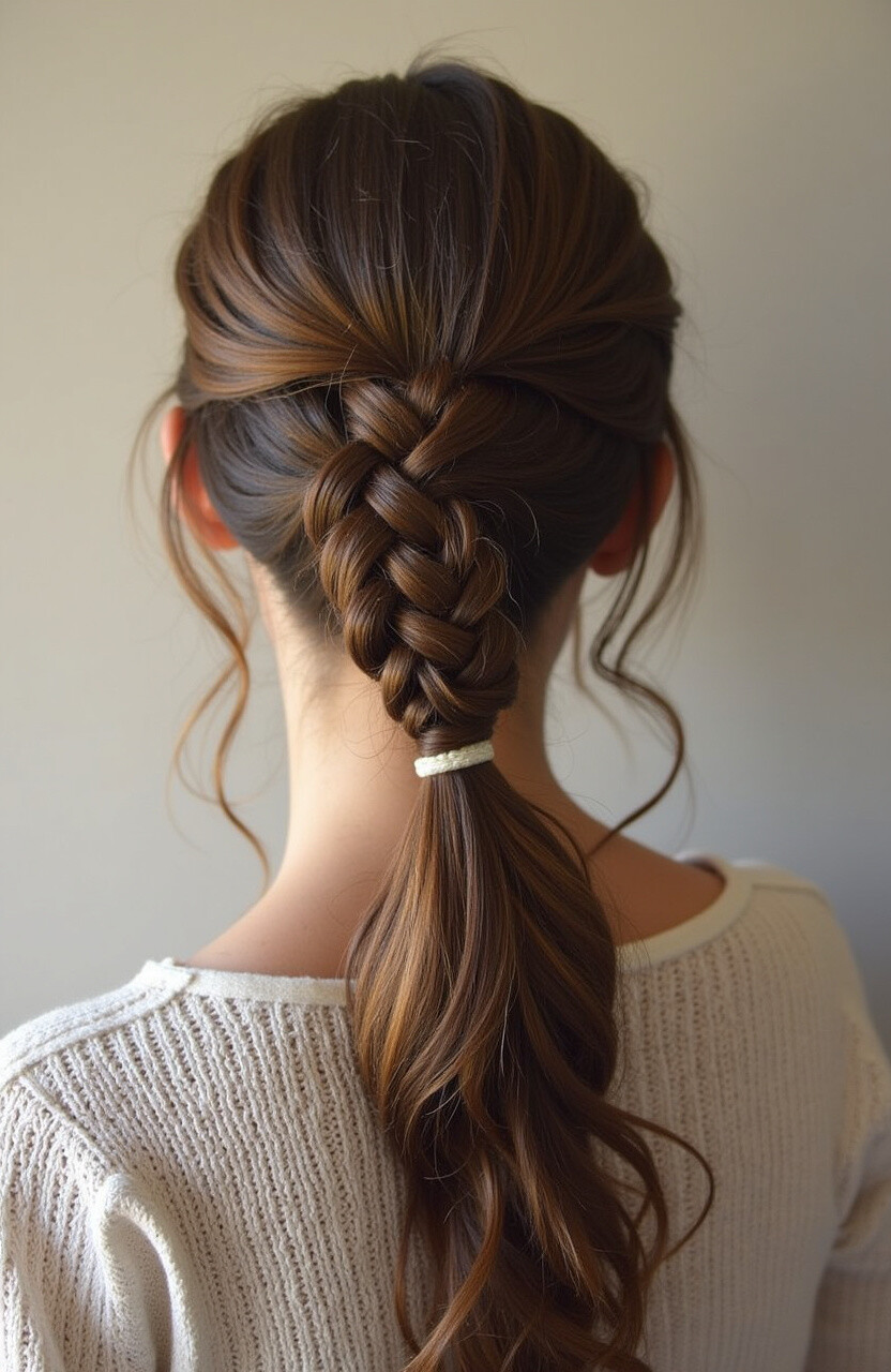 It’s perfect for anyone looking to make a statement. The braid leads into a ponytail, offering a balance of structure and flow. To add a personal touch, incorporate small flowers or beads into the braid.