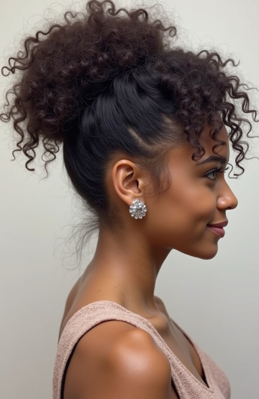 This style is unique because it celebrates natural curls, making them the star of the show. It’s ideal for any occasion where you want to highlight your natural beauty. The curly updo gives you a lively and bouncy appearance.