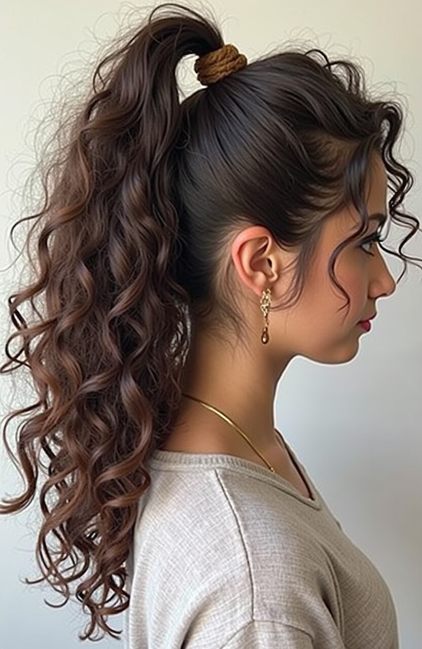 The Curly Ponytail is practical and stylish. It’s perfect for keeping your hair out of your face while still looking chic. This style is great for any occasion.