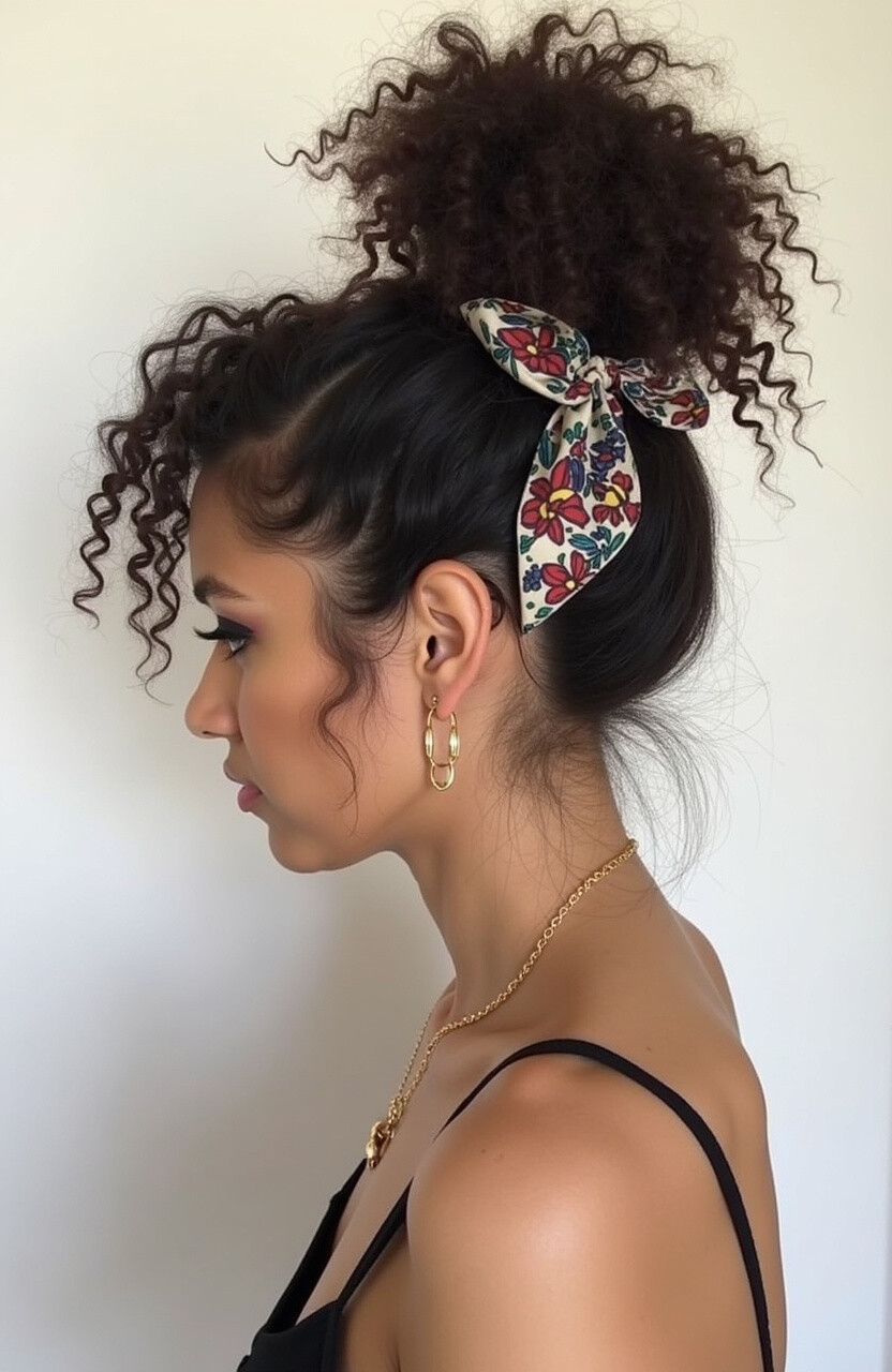 Gather your curls into a high bun and secure with a hair tie. It’s a simple yet elegant look that never fails. Use a silk scarf for added protection and style.