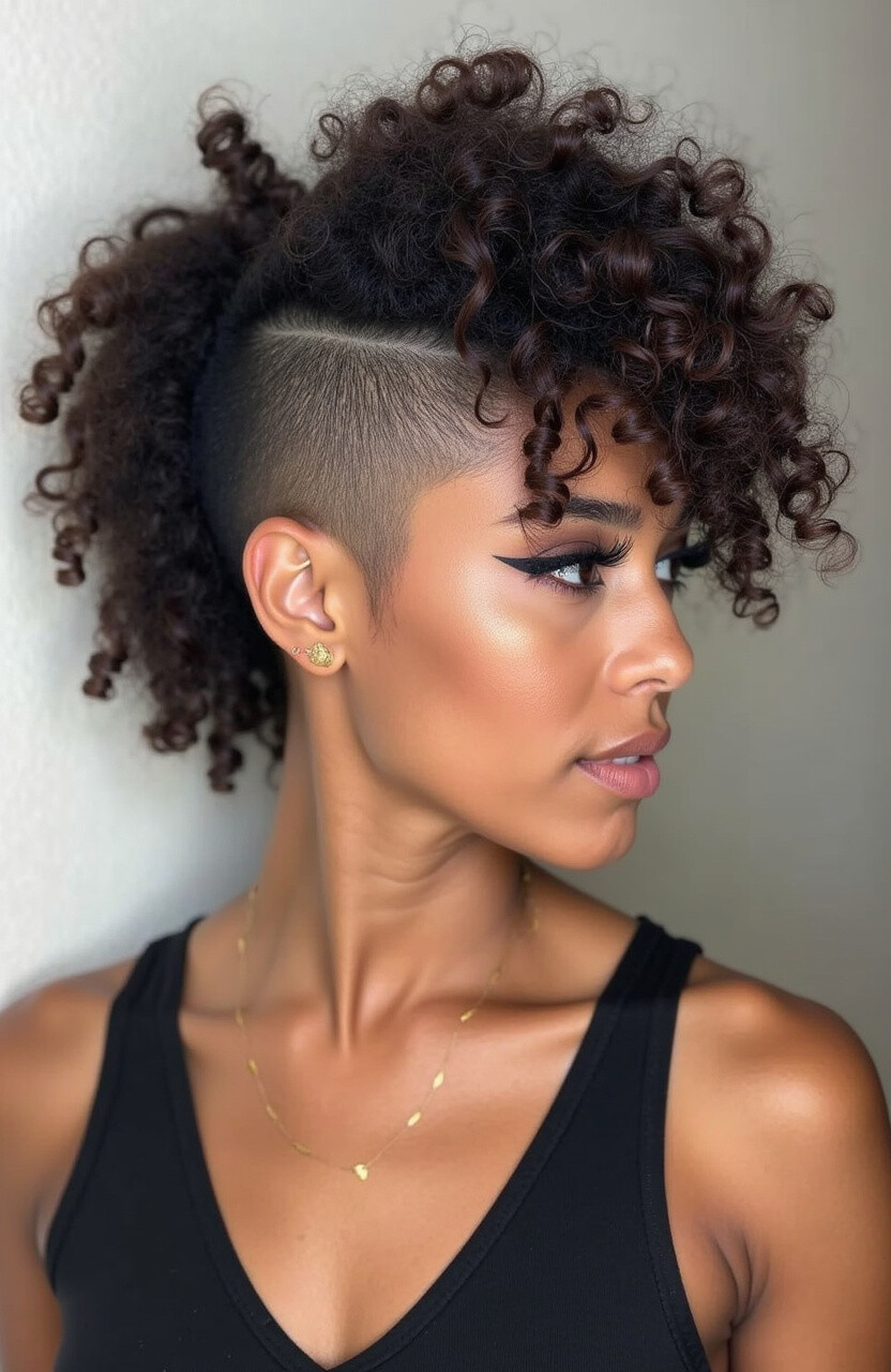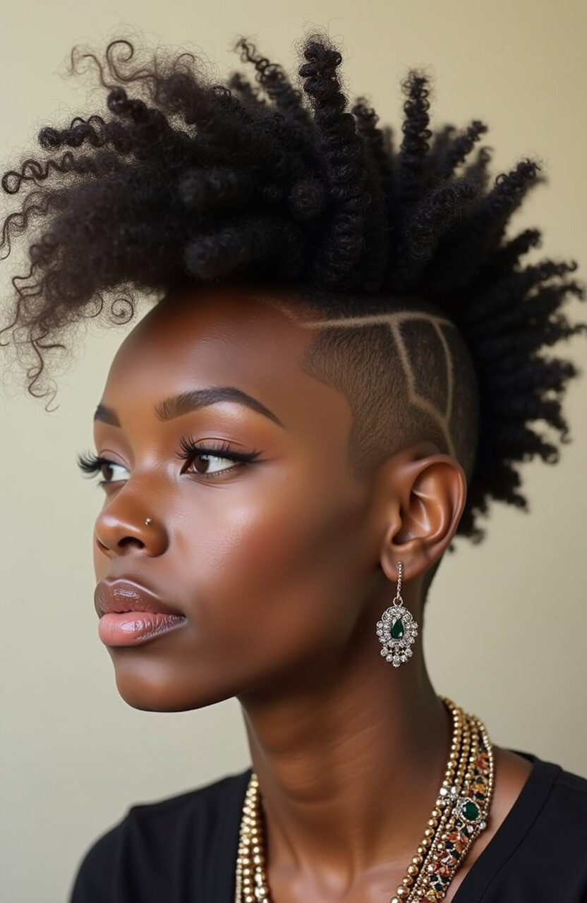 The Curly Mohawk is fierce and bold. It takes the traditional mohawk and gives it a curly twist. This style is for those who love to stand out.