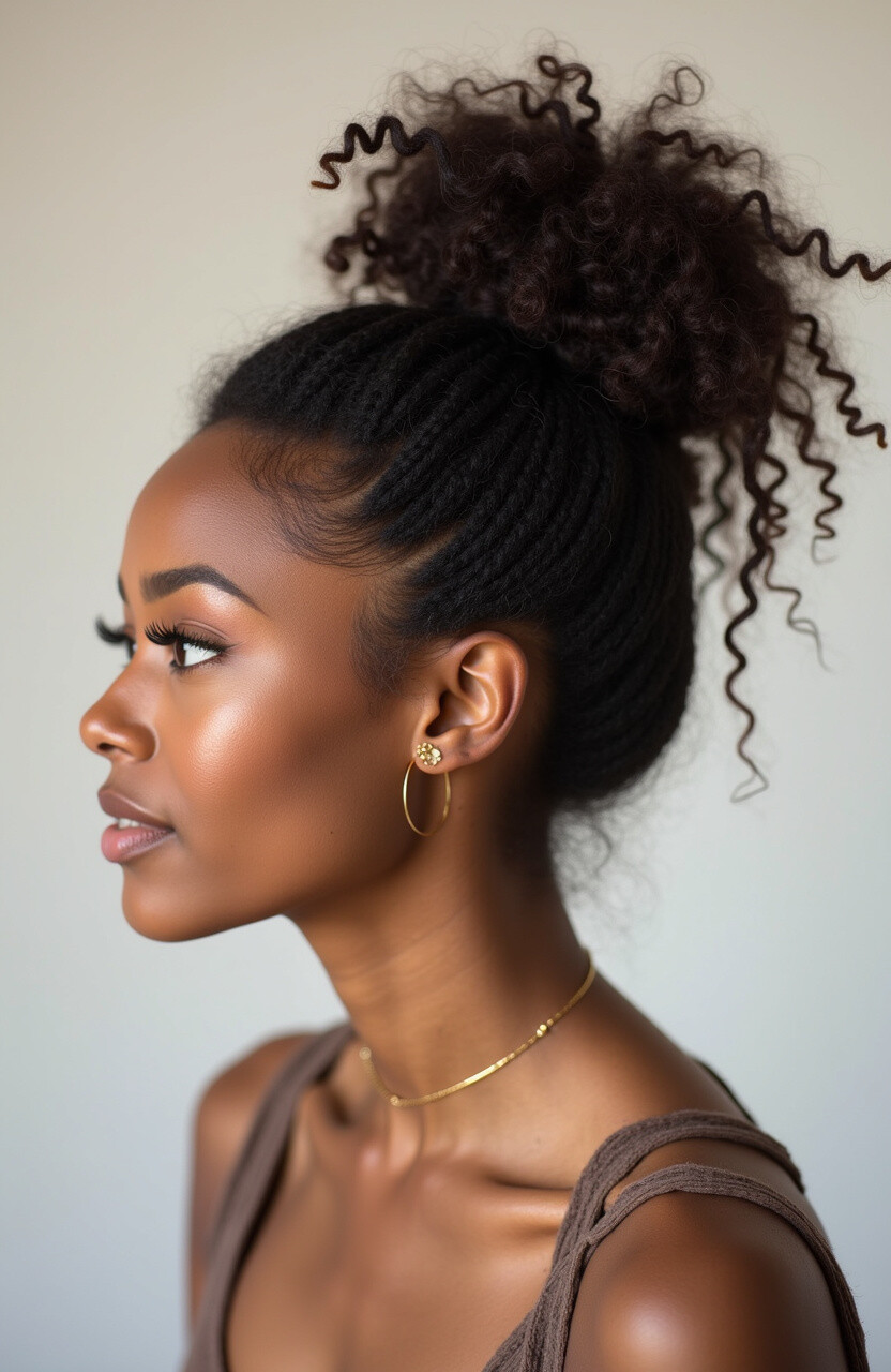 Gather your curls into a high bun and let a few strands fall naturally. It’s a carefree style that still looks put together. Use bobby pins to secure any loose hairs.