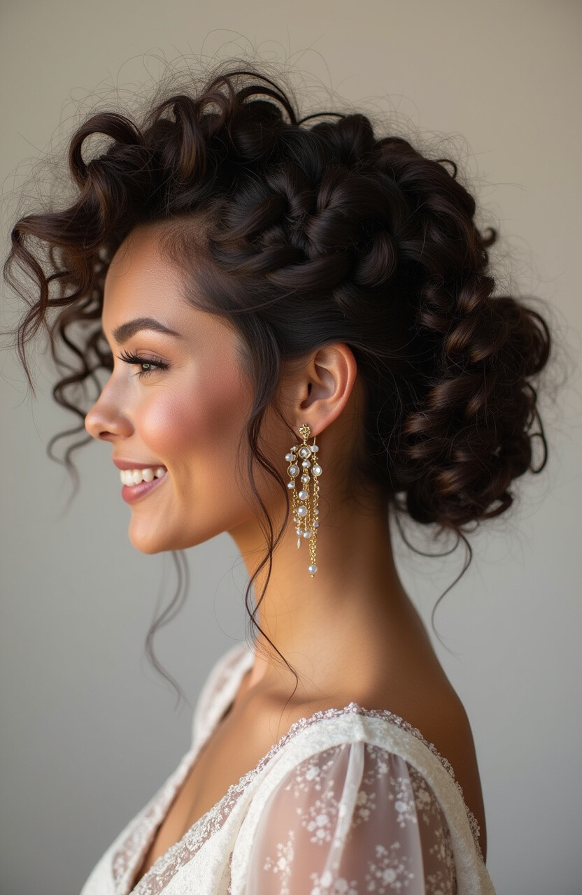 It’s a great way to keep your curls in place while still looking elegant. Use decorative pins or flowers to enhance the look. The braided crown is all about fairy-tale beauty.