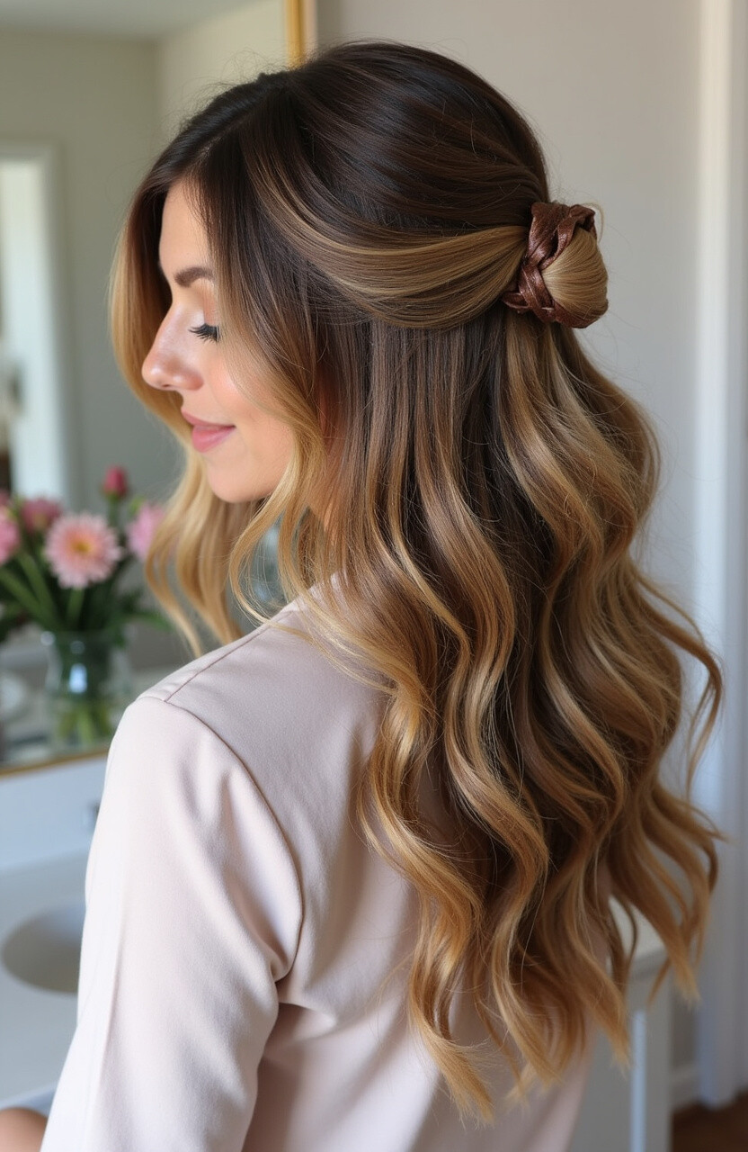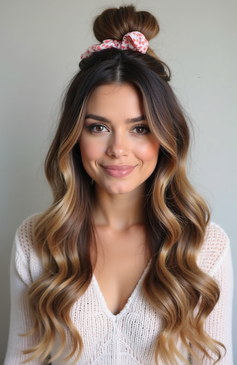 The top knot keeps hair off your face, while the waves add movement and texture. Use a cute hairband or scrunchie to secure the knot.