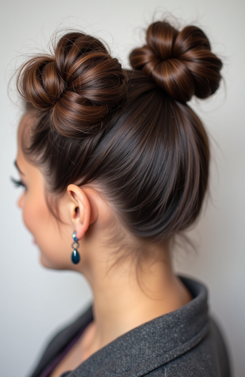 This hairstyle is unique as it blends elegance with the playful nature of double buns. Adding a ribbon or a sleek headband can elevate the look.