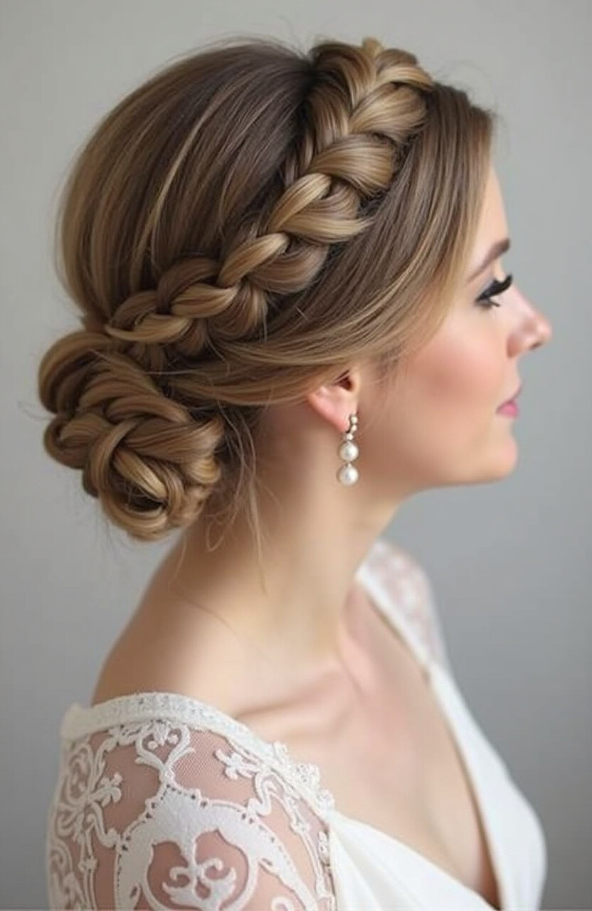 This hairstyle is both unique and romantic. You can add flowers or pearl pins for a touch of elegance. It’s also a great choice if you want to keep your hair off your neck in warmer weather.