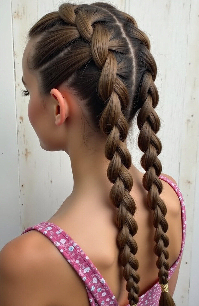 The braids start at the front, running along each side of your head and ending in pigtails. It’s a great look for outdoor activities or a casual day out.