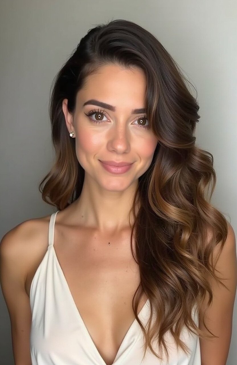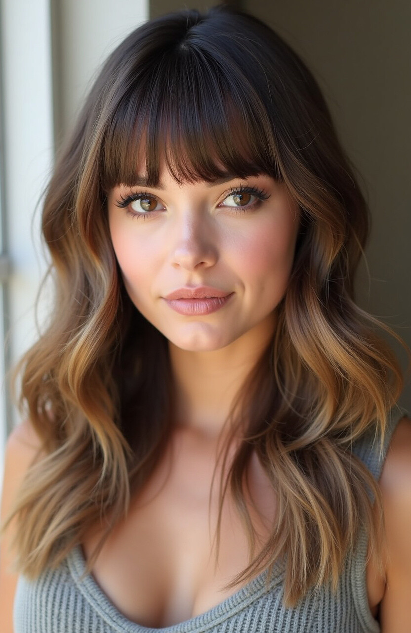 Bangs can be styled to blend seamlessly with the waves, creating a cohesive and polished look. This style is perfect for anyone wanting to experiment with bangs without committing to a full fringe. It’s a versatile option that suits a variety of face shapes and hair types.