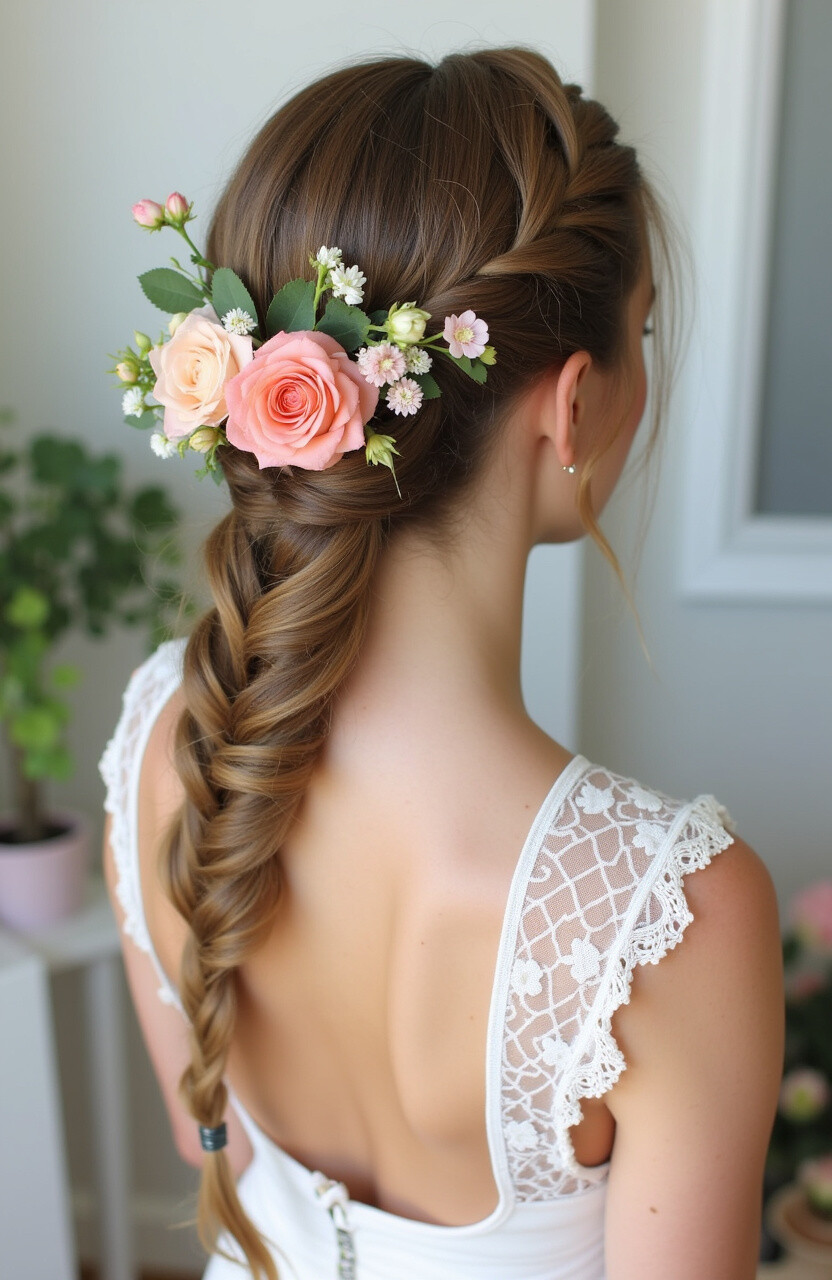 Add a touch of nature to your fishtail braid with flowers. This style is perfect for spring and summer when floral accents are in bloom. It’s a whimsical choice for garden parties and outdoor weddings.