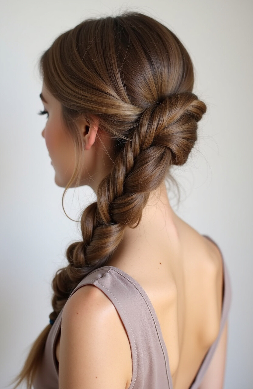 The side fishtail bun is a chic updo that combines a braid and a bun with an asymmetrical twist. It’s great for when you want a polished look with a bit of flair. This style is perfect for any formal occasion.