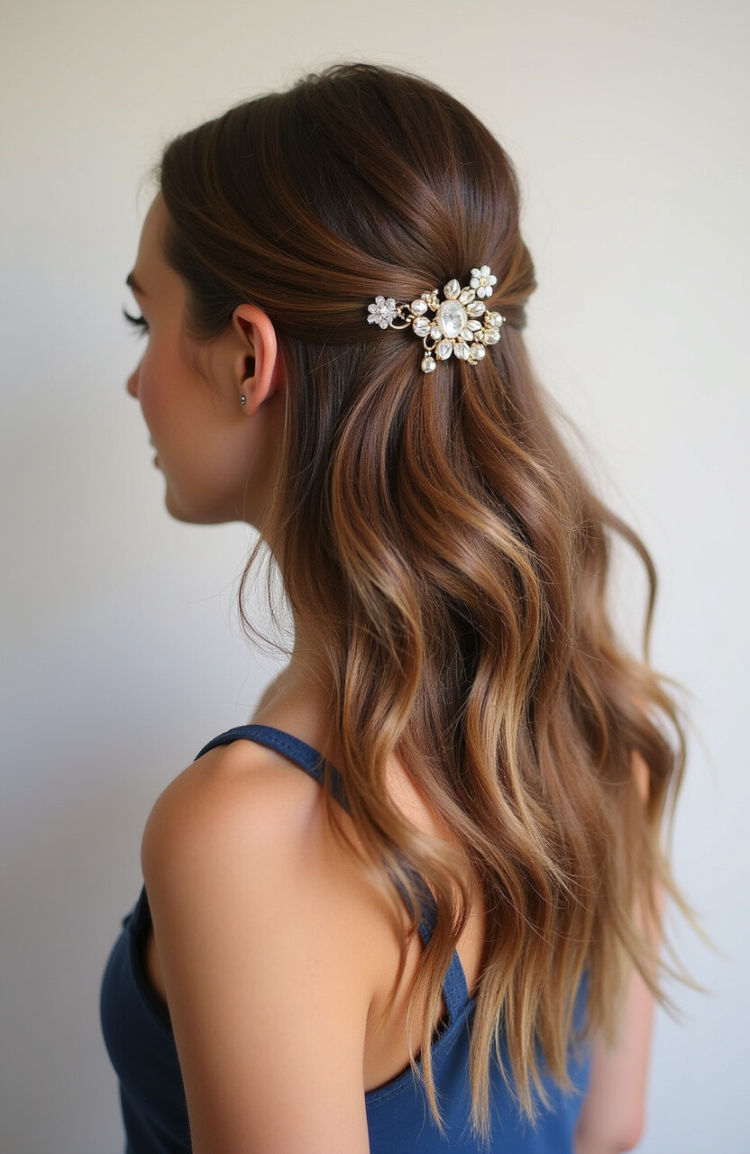 Showcase your personality with a variety of hair clips in your half-up style. This look is all about creativity and fun. It’s great for showing off your collection of quirky or elegant hair accessories.