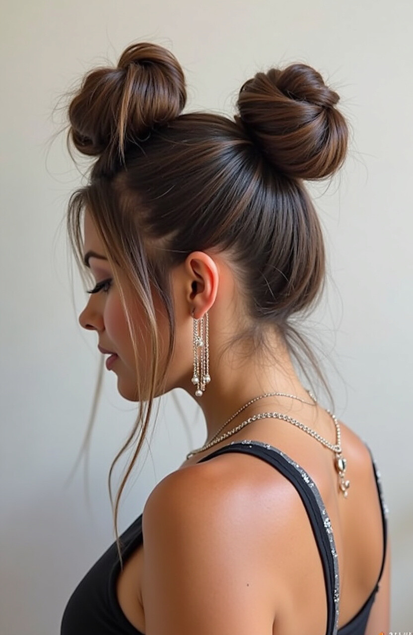 These buns sit high on the head, leaving the rest of your hair to flow freely. Add glitter or colorful hair chalk for a festival-ready look. It’s an easy, budget-friendly style for adventurous souls.