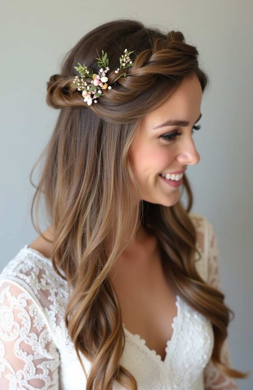 This style keeps hair out of your face while letting your locks flow freely. Add some floral pins to personalize it! It’s great for both casual outings and formal events. You can create this look with just a handful of bobby pins and a touch of hairspray.