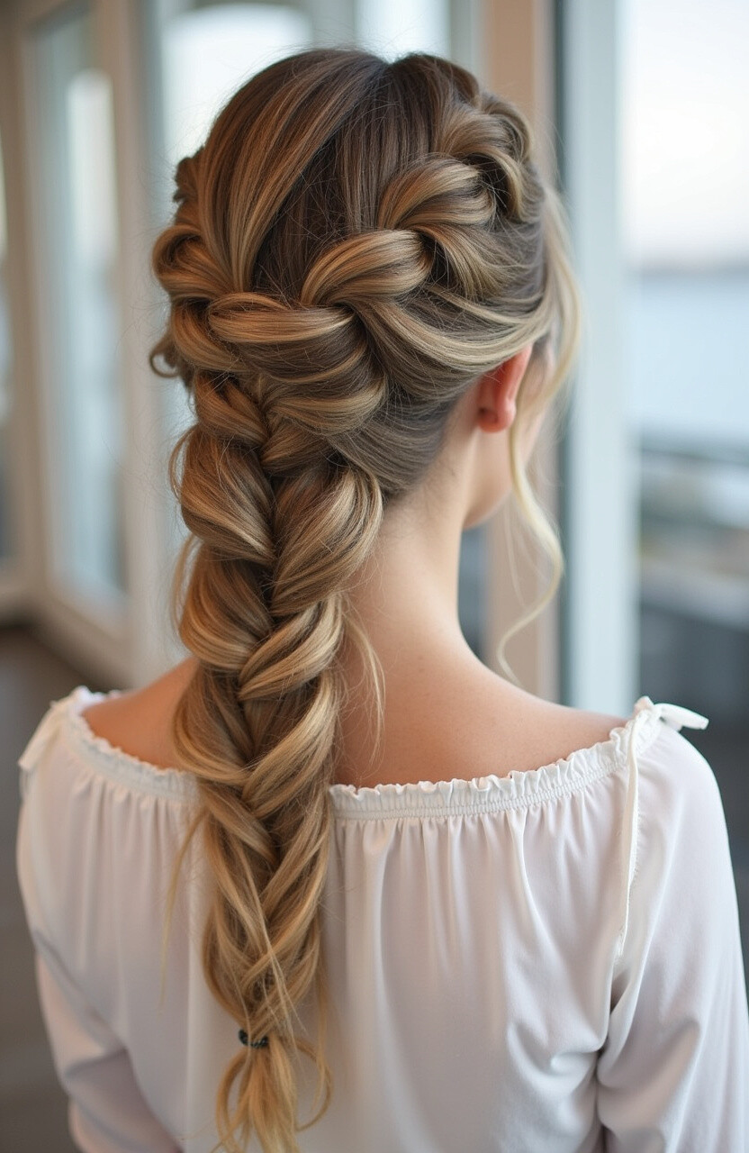 Catch the waves with a Fishtail Braid that gently cascades down your back. This intricate style is worth the effort for its stunning visual appeal. It’s unique for its complex yet achievable design.