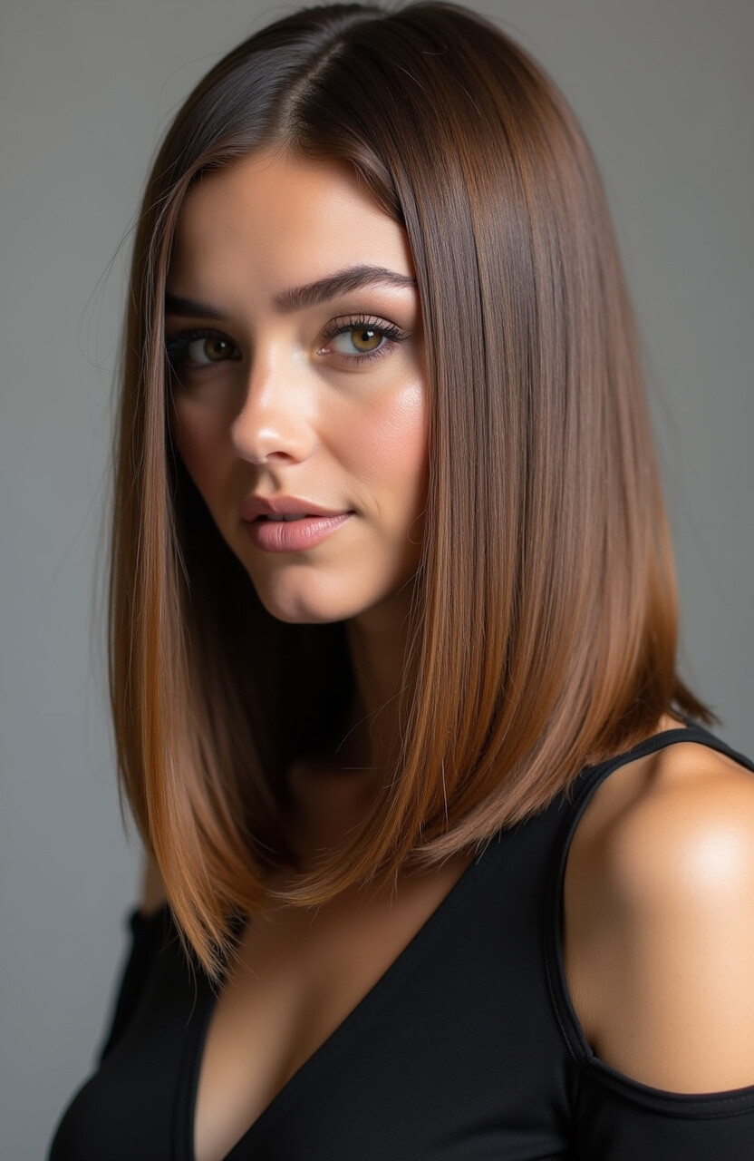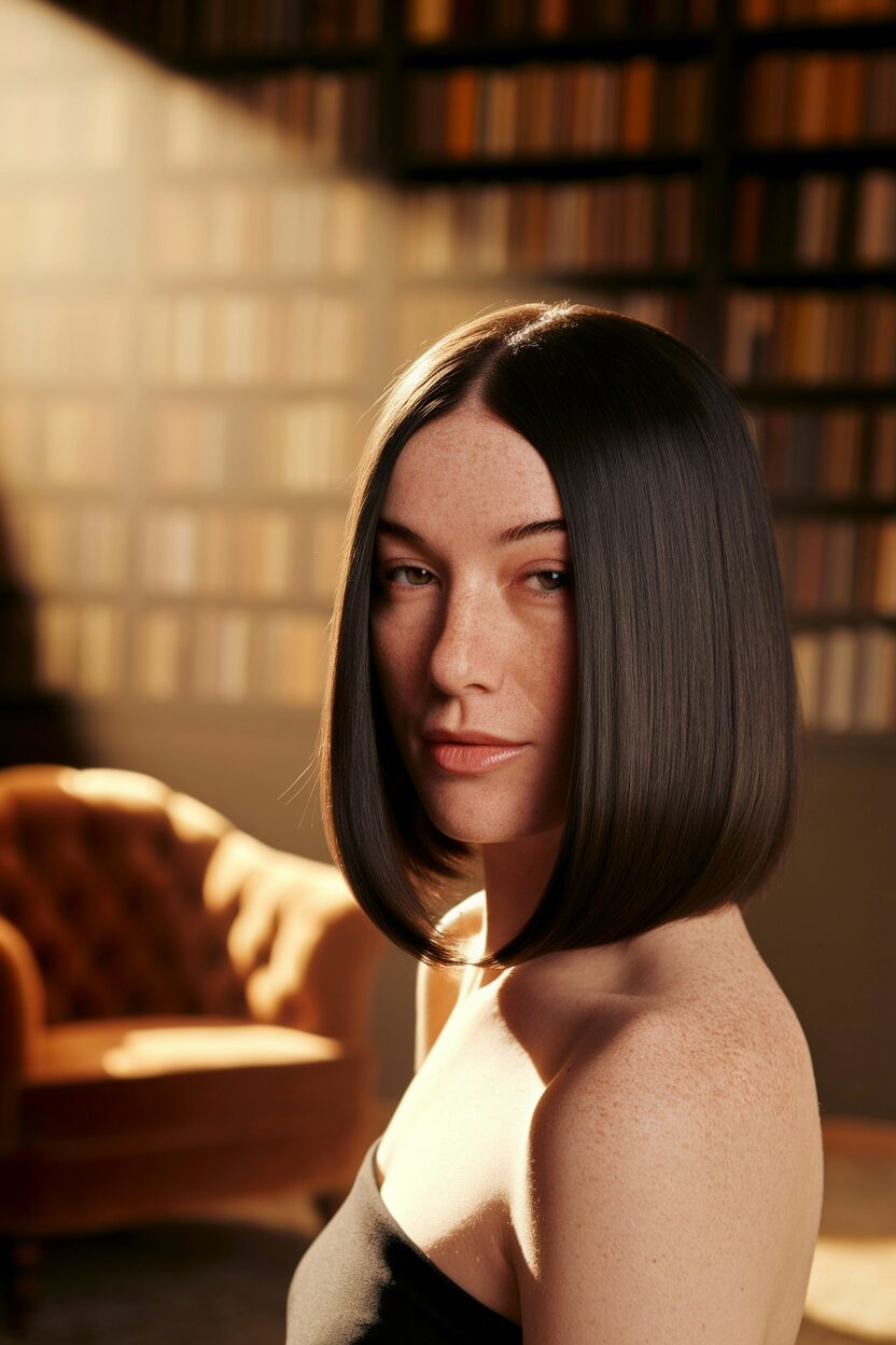 Imagine the glossy shine of perfectly straightened hair falling just above your shoulders. This style gives you a polished look that’s perfect for any occasion. It’s easy to maintain with a straightener and some heat protectant spray.