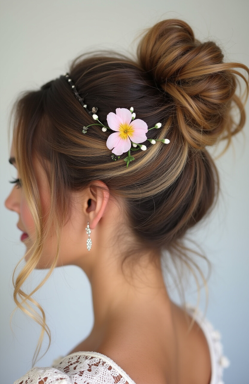 Embrace nature with the floral loose bun. This style incorporates fresh or artificial flowers for a charming, natural look.