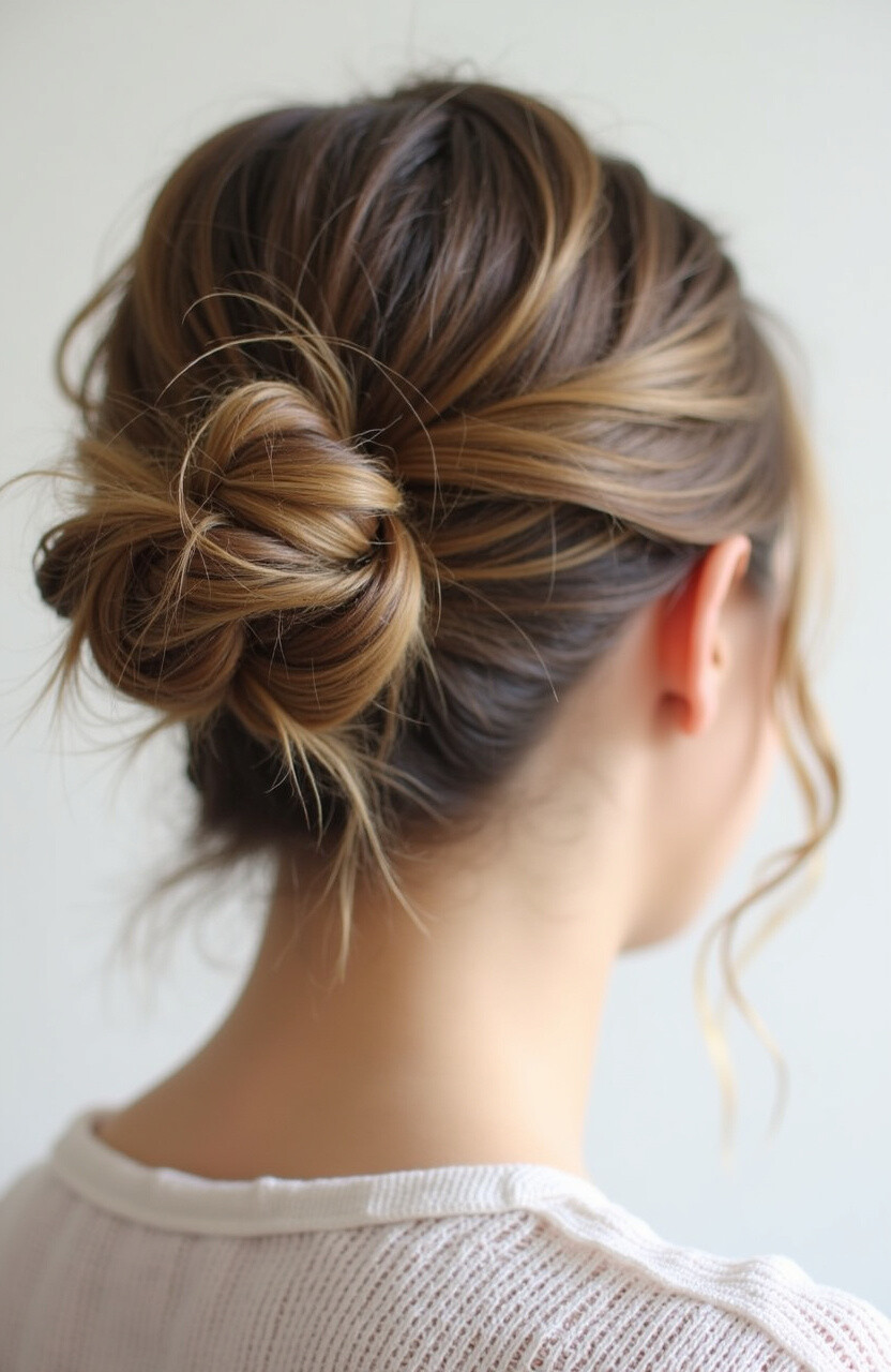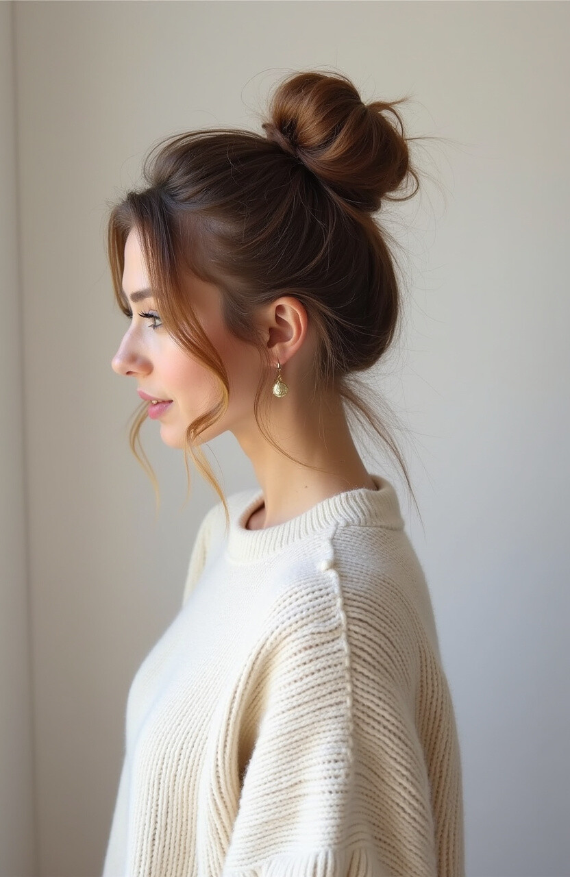 To achieve this look, tease your hair slightly before gathering it into a loose bun. Let some strands fall naturally for that perfectly imperfect finish. This bun is versatile and can be dressed up or down.