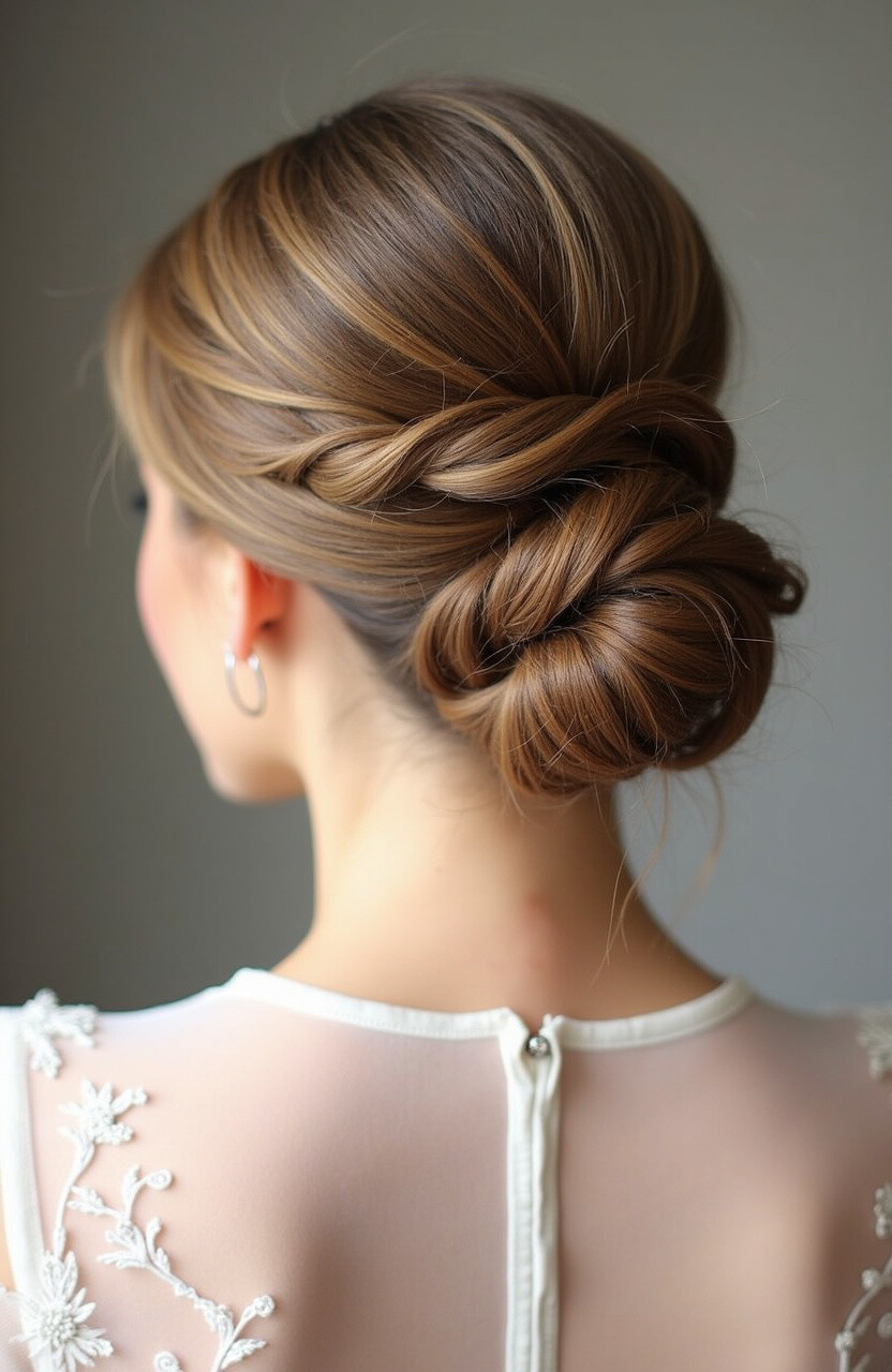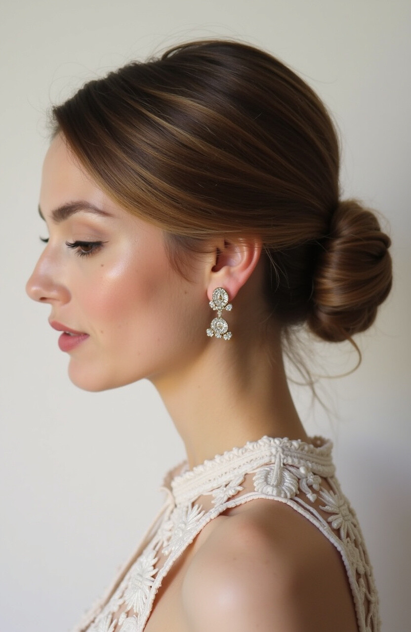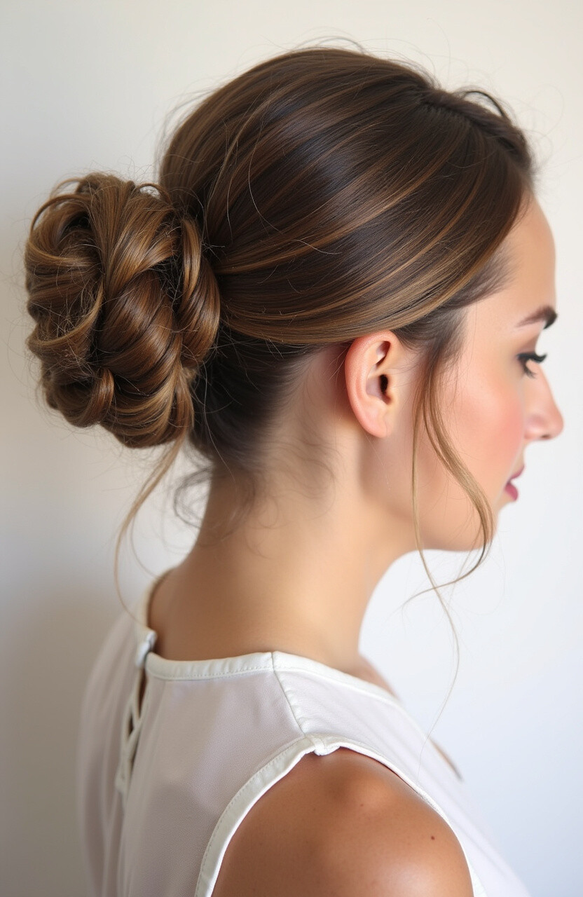 This bun works wonderfully with a soft, flowing dress. It’s an excellent choice for weddings or date nights.