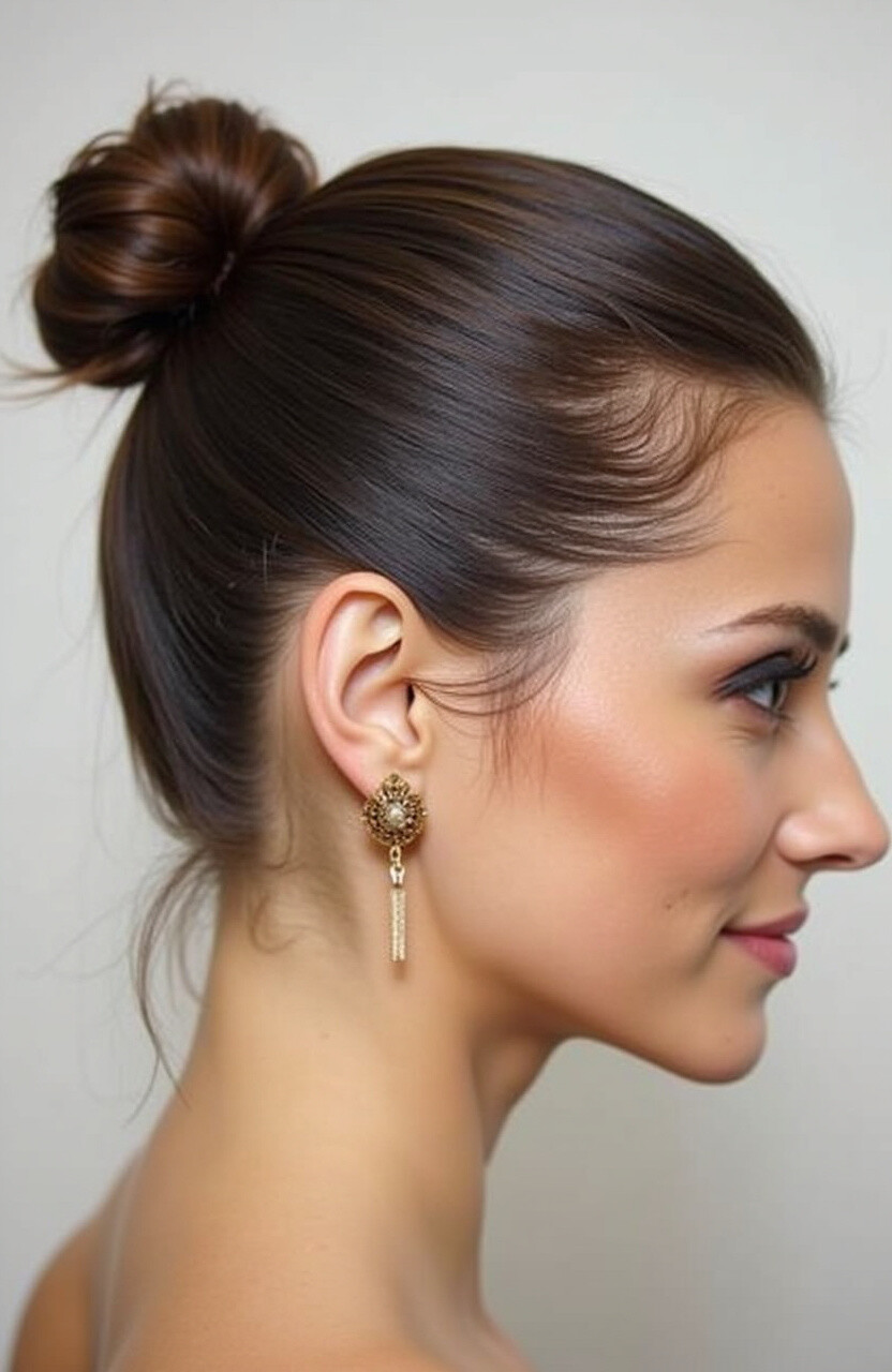 Pair this bun with a pair of statement earrings to complete the look. It’s perfect for both office wear and elegant evenings out.