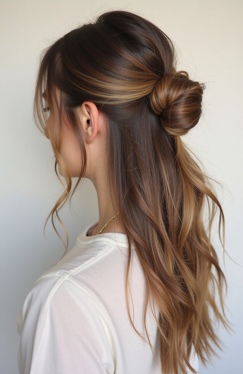 Combine the best of both worlds with a half-up loose bun. This style allows you to enjoy the beauty of both loose and styled hair.