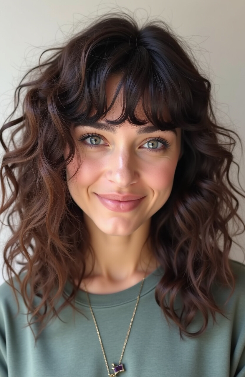 Combine two trends into one with loose curls and bangs. This style adds a touch of playfulness and is perfect for those who want to experiment with their look.