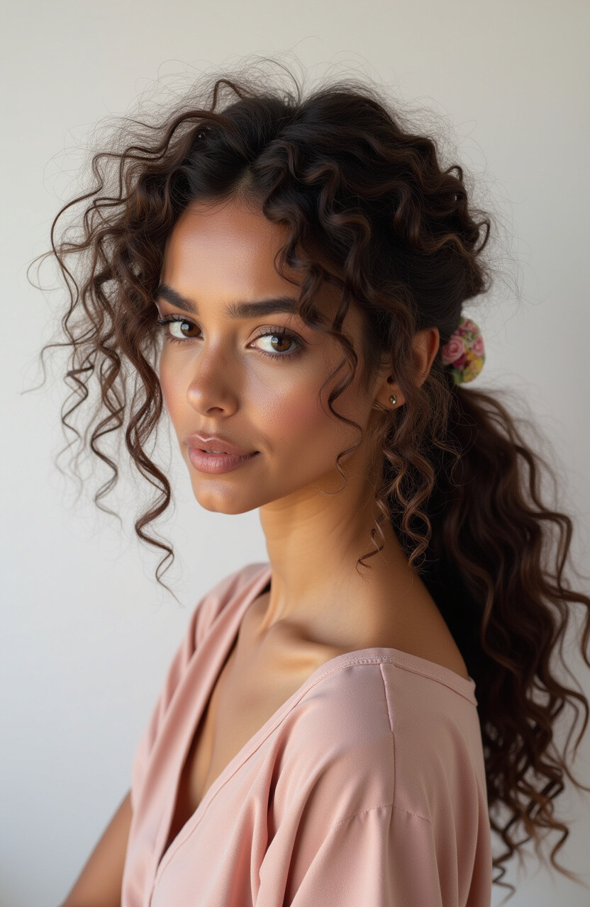 Gather your curls into a low or high ponytail, leaving some tendrils loose around your face for a soft effect. It’s a great way to showcase your curls while keeping your hair neat and tidy.
