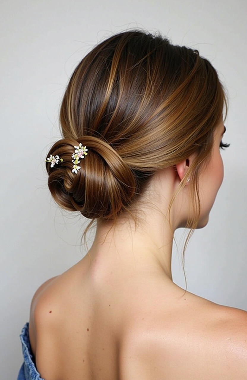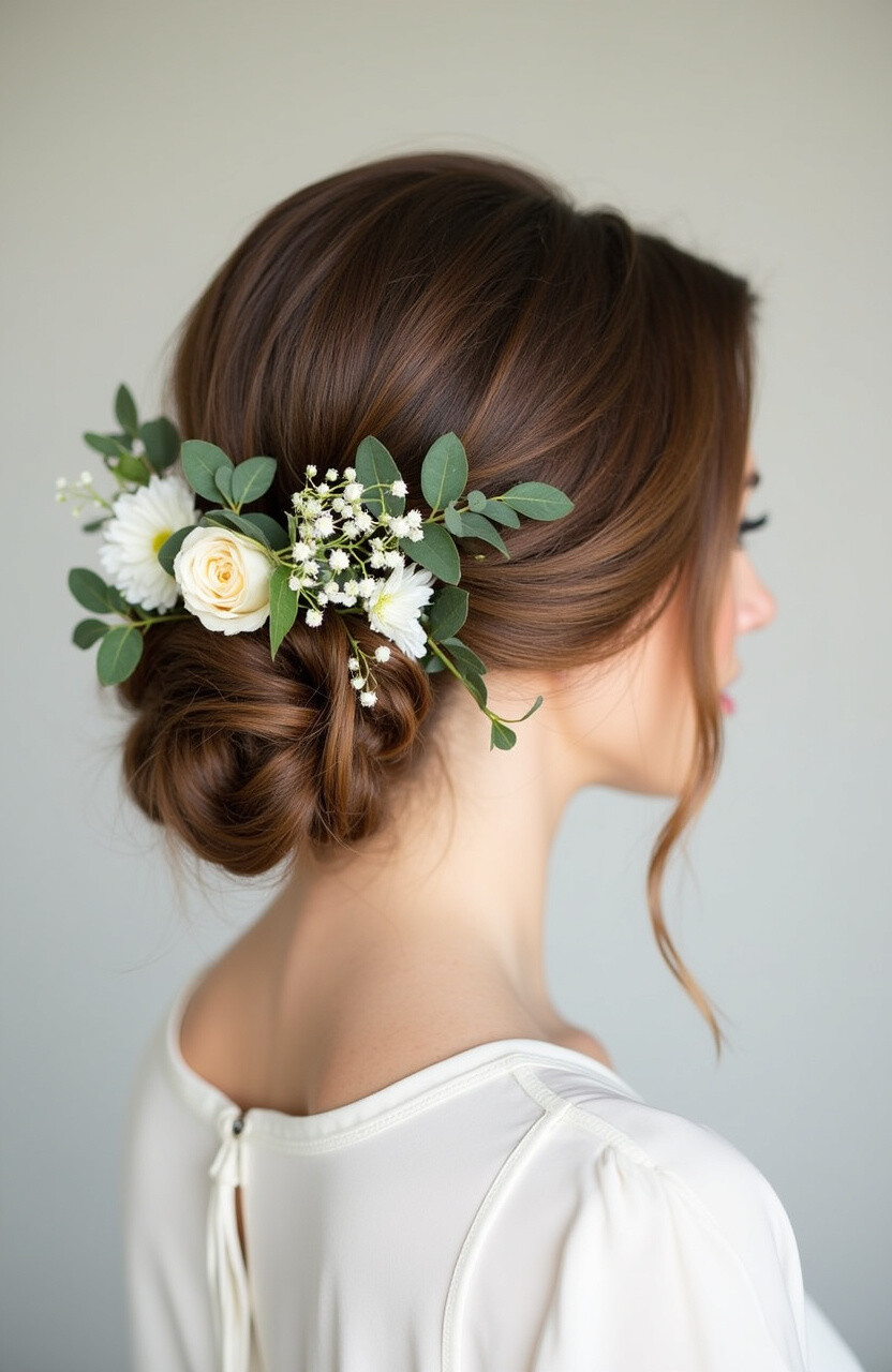 Bring a touch of nature into your hairstyle with a Floral Low Bun. By adding fresh or faux flowers, you infuse your look with whimsy and charm.