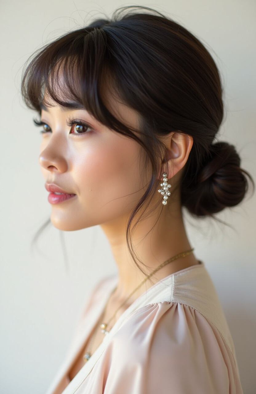Perfect for round face shapes, this style brings attention to your eyes and cheekbones. The combination of the bun and bangs offers a balanced look, making it ideal for any setting.