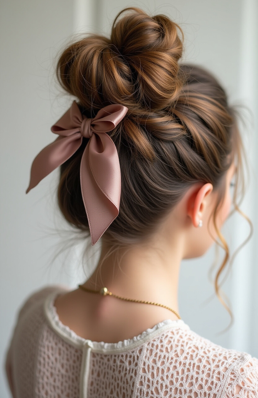 Ribbons are a sweet addition to any messy bun. They add a vintage or romantic touch, depending on your choice.