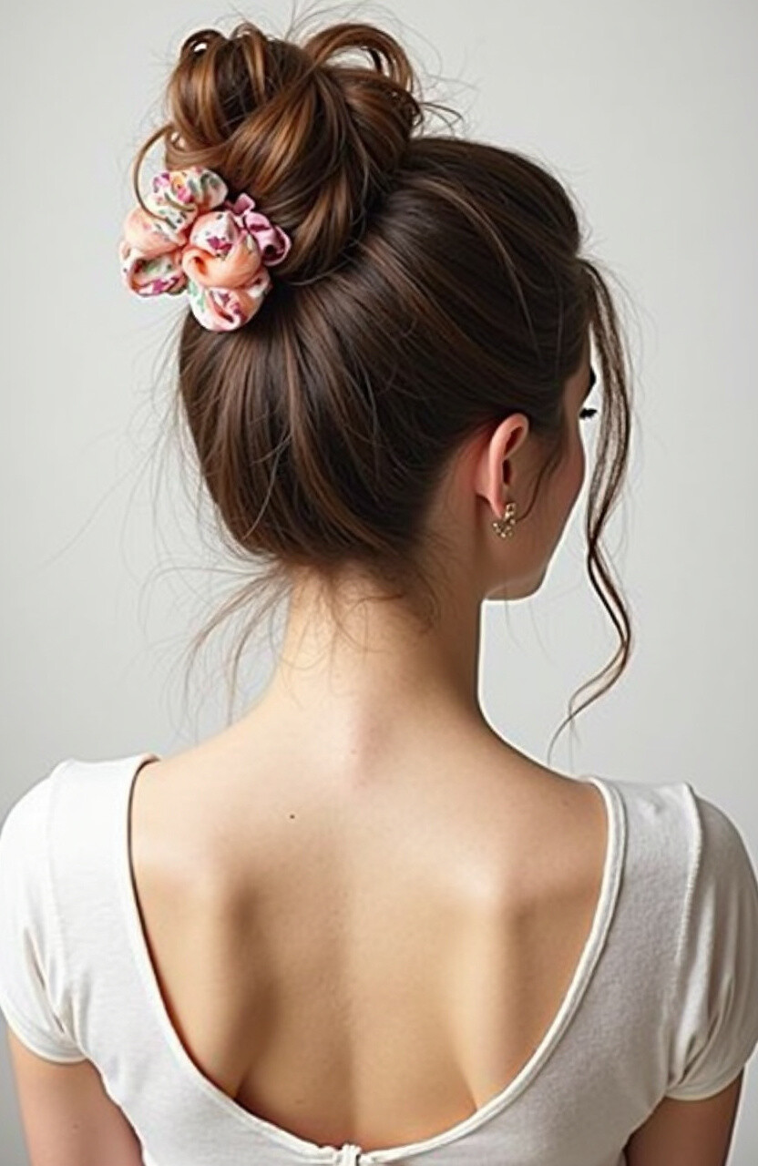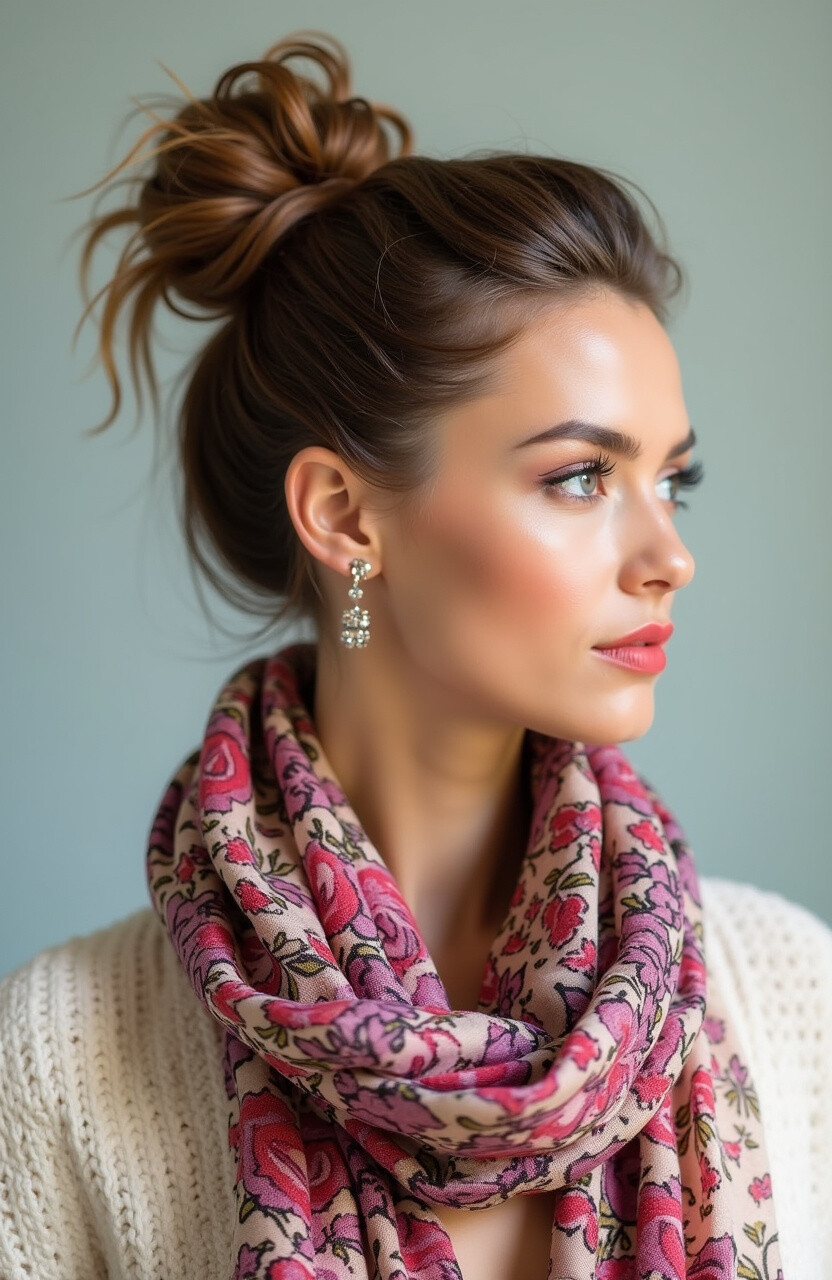 Make your messy bun pop with a vibrant scarf. This accessory can turn a simple bun into a statement piece.