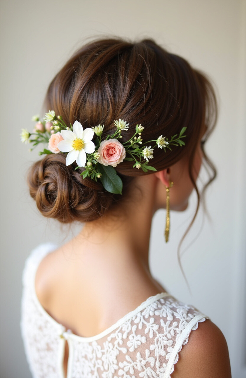 Bring a touch of nature to your hair with a floral embellished messy bun. It’s perfect for weddings or garden parties.