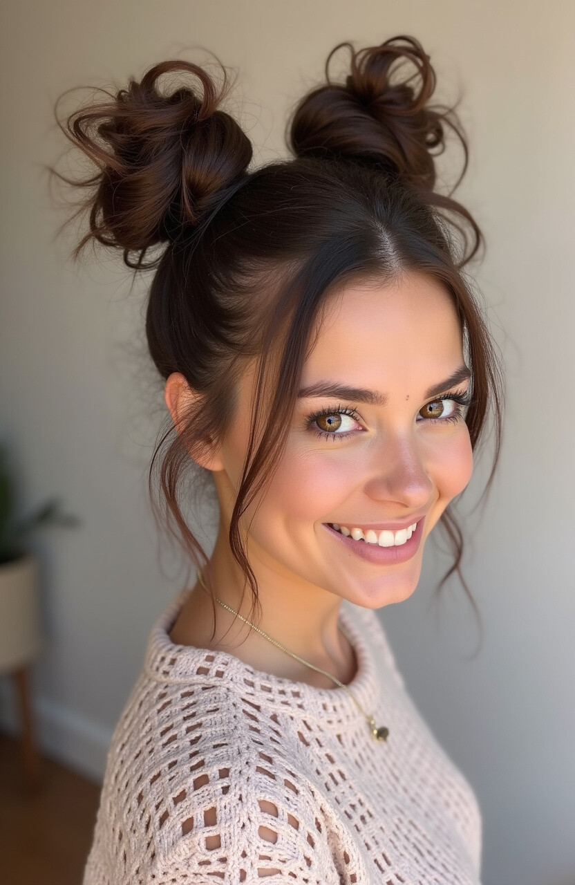 Double the fun with double messy buns! This playful style is perfect for anyone who loves to stand out.