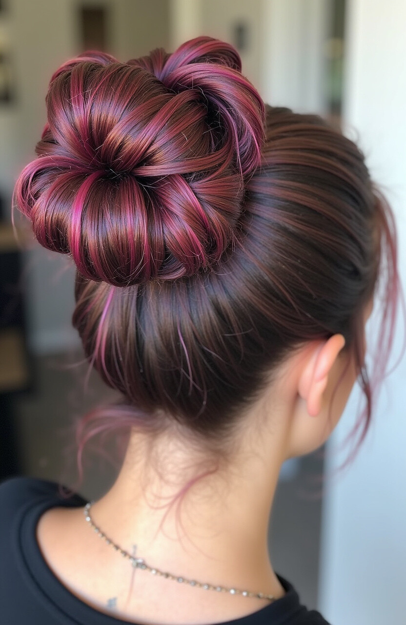 This style is perfect for those who love experimenting with colors. Underlights peek through the bun, giving a playful effect.
