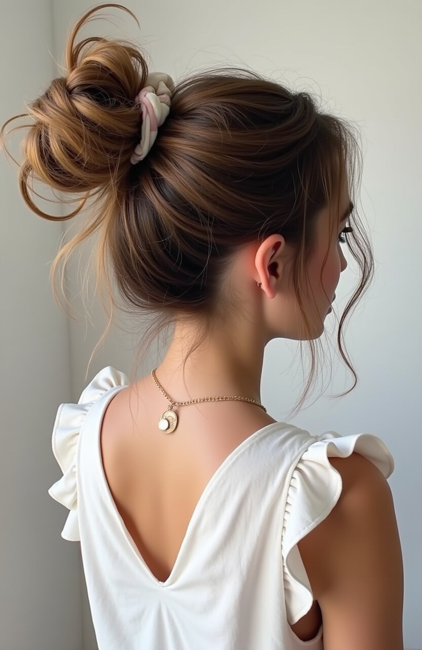 What makes this look unique is its adaptability. You can personalize it with a jeweled hairpin or a subtle braid. The cost is minimal; all you need is a good hair tie and some bobby pins.