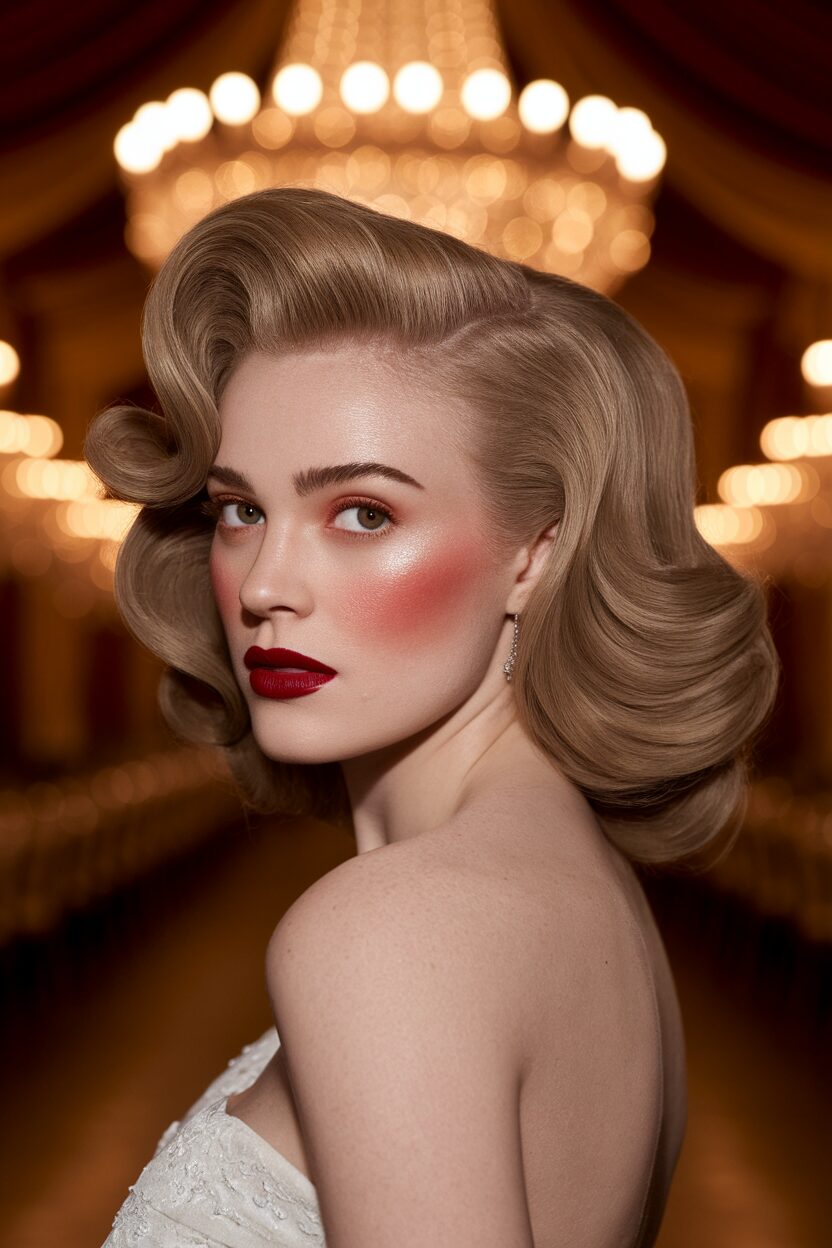 Create deep waves using a curling iron or hot rollers. Brush through them gently for a polished finish. This style works best on long hair and pairs beautifully with a satin gown.