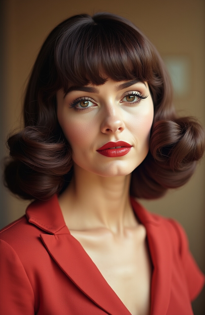 Use a round brush to roll the bangs and secure them with pins. This look pairs well with retro outfits and bold lipstick.