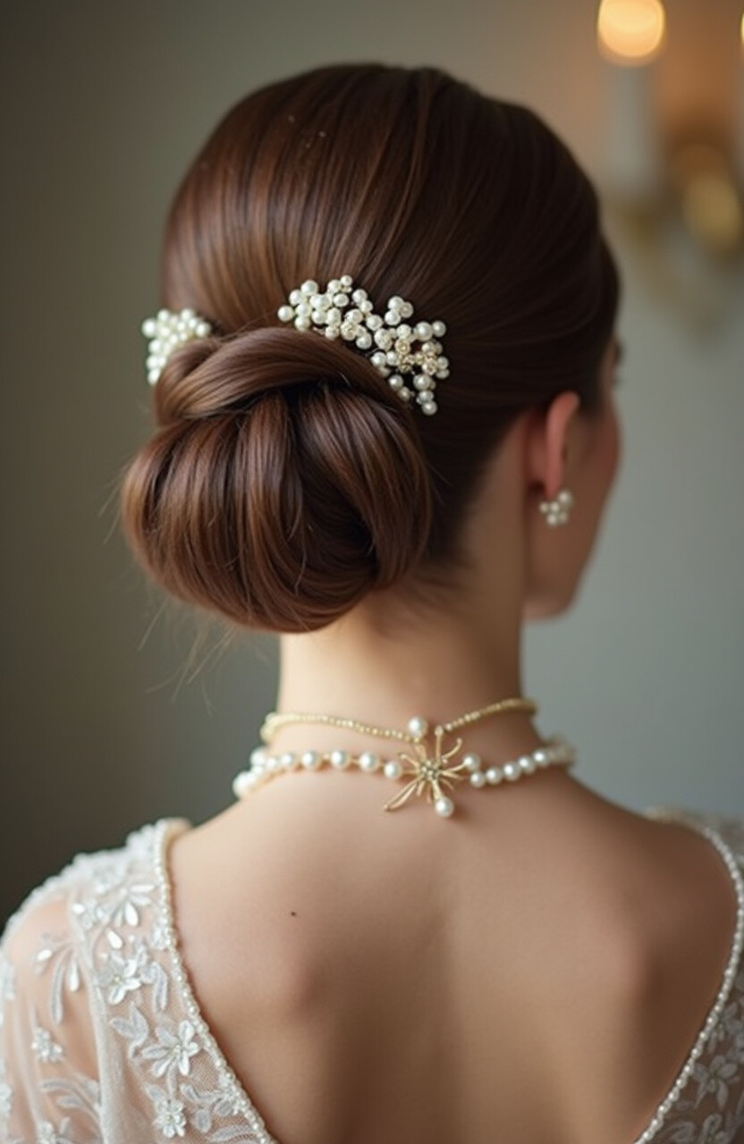 Gather your hair into a low bun and secure it with pins. Use a smoothing serum for a sleek finish. This look pairs beautifully with a classic gown and pearls.